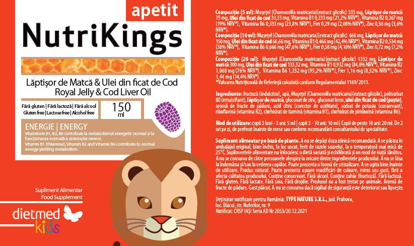 5 ml: fructoză (îndulcitor), apă, Mușețel (Chamomilla matricaria)(extract glicolic) 333 mg, polisorbat 80 (emulsifiant), lăptișor de matcă 75 mg, gluconat de zinc 0.36 mg , gluconat feros 0.29 mg, ulei din ficat de cod (pește) 33.33 mg, aromă de fructe de pădure, acid citric (corector de aciditate), sorbat de potasiu (conservant), riboflavină (Vitamina B2) 0.267 mg (19% VNR*), clorhidrat de tiamină (Vitamina B1) 0.233 mg (21.1% VNR*), clorhidrat de piridoxină (Vitamina B6) 0.333 mg (23.8% VNR*).