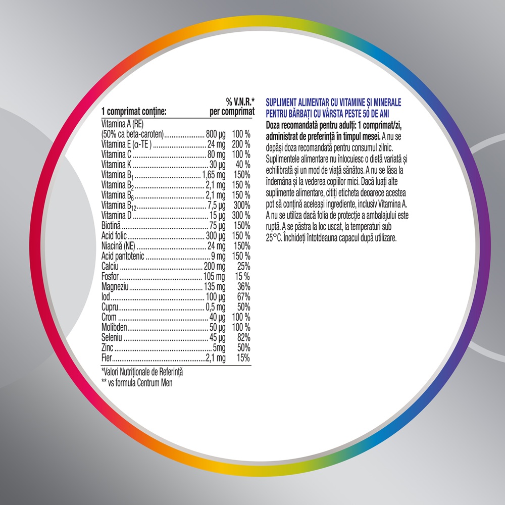 Special formulat pentru a satisface nevoile nutriționale ale bărbaților cu vârsta peste 50 de ani, cu vitamine și minerale care să susțină zilnic: