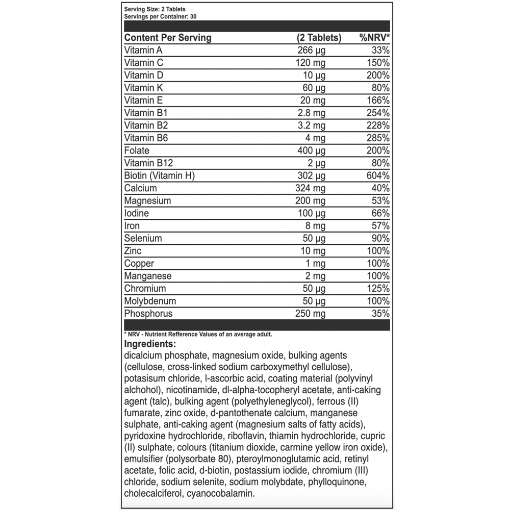 Acid L-ascorbic (Vitamina C), DL-alfa-tocoferil acetat (Vitamina E), Clorhidrat de piridoxina (Vitamina B6), Riboflavina (Vitamina B2), Clorhidrat de tiamina (Vitamina B1), Acid pteroilmonoglutamic (Vitamina B9 – folat), Acetat de retinil (Vitamina A), D-biotina (Vitamina B7 – biotina), Cianocobalamina (Vitamina B12), Filoquinona (Vitamina K1), Colecalciferol (Vitamina D3), Fumarat feros (II) (Fier), Iodura de potasiu (Iod), Oxid de zinc (Zinc), Sulfat cupric (II) (Cupru), Sulfat de mangan (Mangan), Clorura de crom (III) (Crom), Selenit de sodiu (Seleniu), Molibdat de sodiu (Molibden), Fosfat dicalcic (Calciu + Fosfor), Oxid de magneziu (Magneziu).