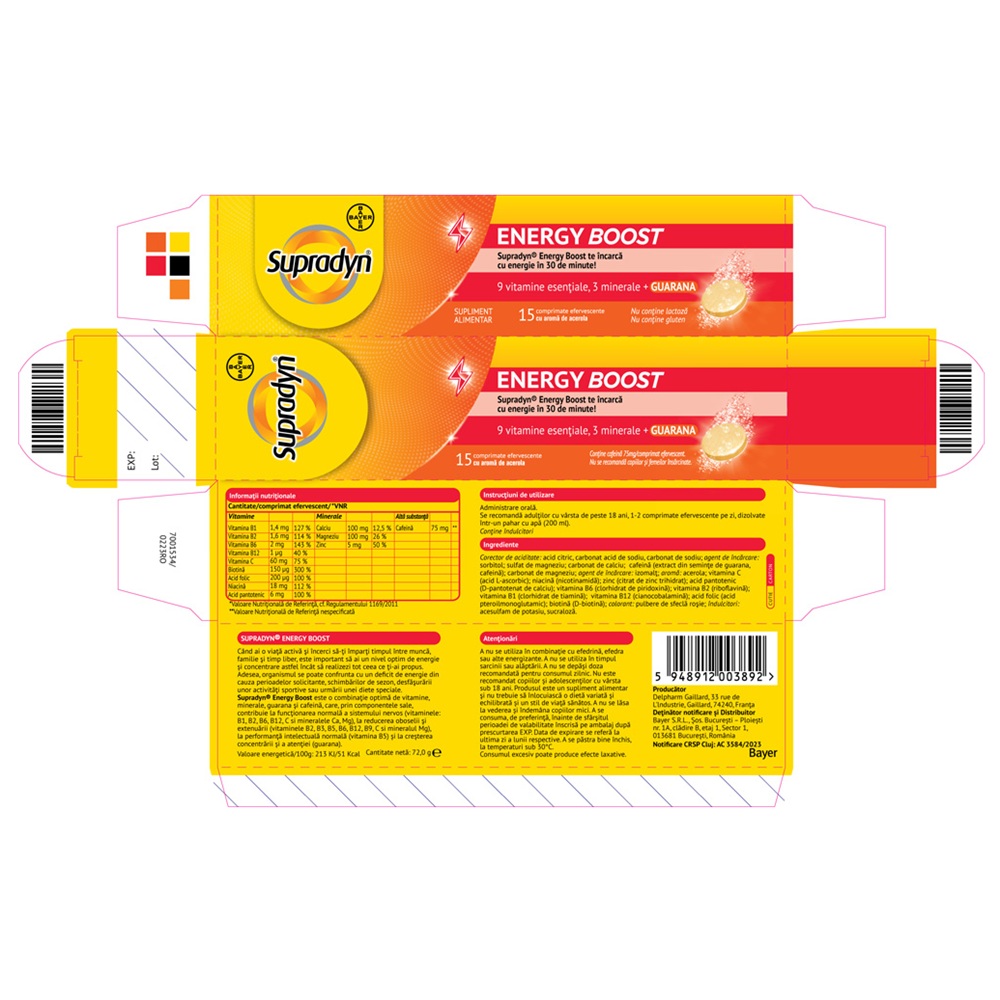 Multivitamine si minerale Supradyn Energy Boost 15 comprimate efervescente Bayer(contine 9 vitamine esentiale, 3 minerale si guarana) face parte din categoria supliment alimentar.