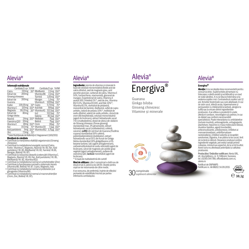 Premix de vitamine si minerale in baza de celuloza microcristalina (fosfat acid de calciu dihidrat, oxid de magneziu greu, acid ascorbic granular, carbonat de calciu, Vitamina E 50%, fumarat feros, niacinamida, gluconat de mangan, D-pantotenat de calciu, Vitamina A acetat 500, D-biotina 1%, oxid de zinc, Vitamina B12 0,1%, Vitamina D3 100, acid folic 10%, Vitamina K1 5%, clorhidrat de piridoxina, mononitrat de tiamina, riboflavina, sulfat de cupru anhidru, iodura de potasiu 10%*, molibdat de sodiu dihidrat, selenit de sodiu anhidru, clorura de crom (III) hexahidrata), Celuloza microcristalina (agent de incarcare), Extract hidroetanolic uscat 7-9:1 (maltodextrina, dioxid de siliciu) din radacini de Ginseng chinezesc (Panax ginseng) standardizat max. 2% ginsenozide, Extract hidroetanolic uscat (maltodextrina, cofeina, caramel, sulfiti) din samburi de Guarana (Paullinia cupana) standardizat 16% cafeina, Polivinilpolipirolidona (stabilizator), Extract hidroetanolic uscat 50:1 din frunze de Ginkgo biloba standardizat 24% ginkgoflavone si 6% terpene lactone, Talc (agent antiaglomerant), Carboximetilceluloza de sodiu reticulata (agent de incarcare), Saruri de magneziu ale acizilor grasi vegetali (agent antiaglomerant), Pulbere de coenzima Q10, Lactoza monohidrat (agent de incarcare).