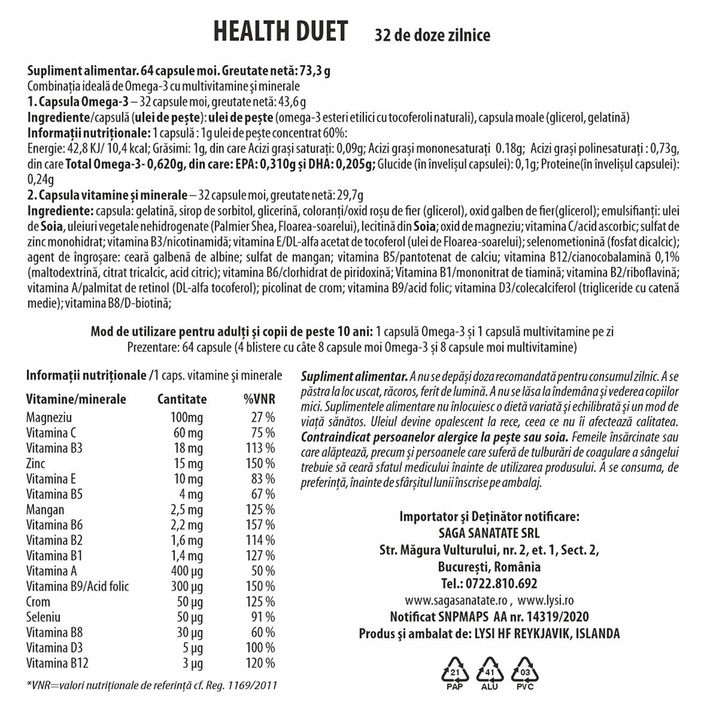 - contine 4 blistere cu cate 8 capsule moi Omega-3 si 8 capsule moi multivitamine.