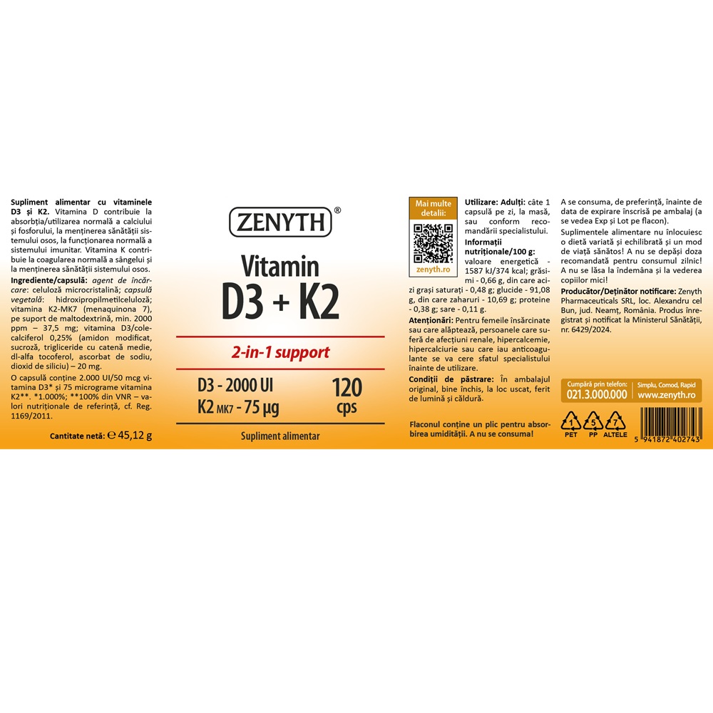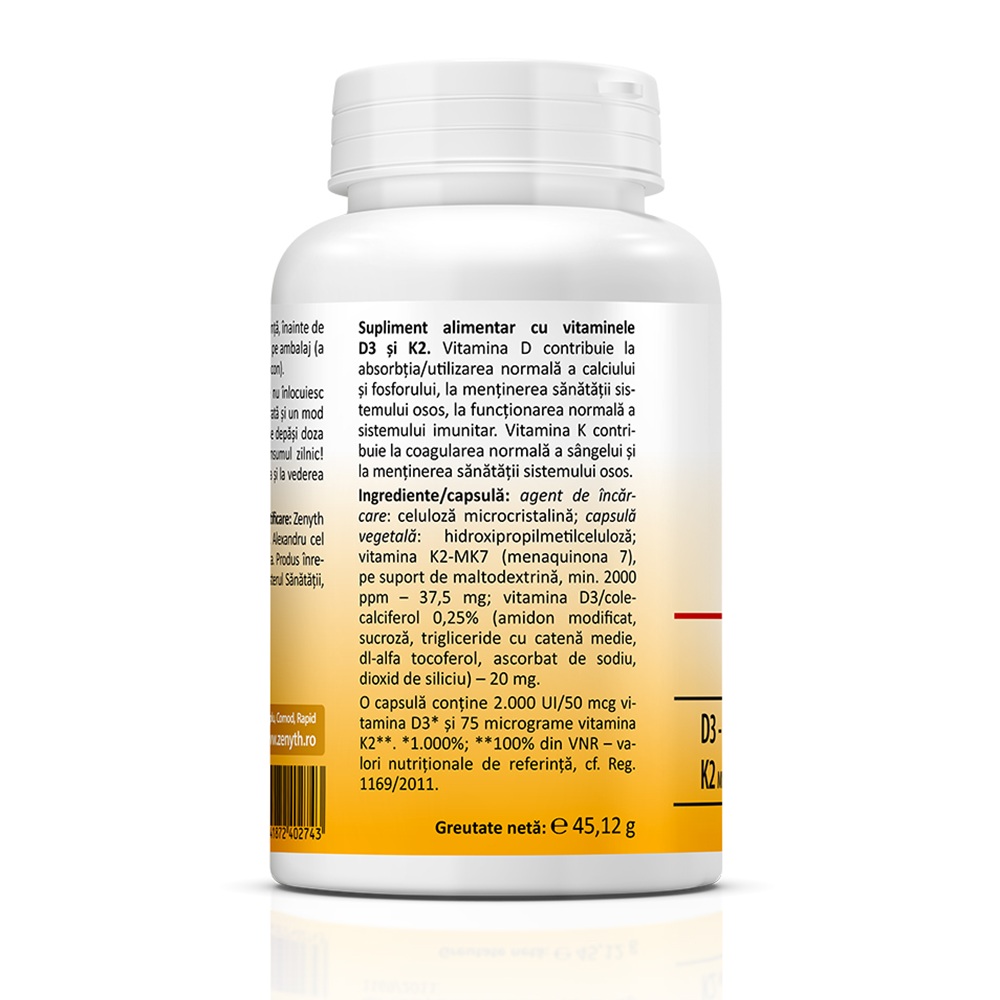 Ingrediente:Agent de încărcare: celuloză microcristalină, capsulă vegetala hidroxipropilmetilceluloză, vitamina K2-MK7 (menaquinona-7) pe suport de maltodextrină min. 2000 ppm – 37,5 mg, vitamina D3/colecalciferol 0,25% (amidon modificat, sucroză, trigliceride cu catenă medie, dl-alfa tocoferol, ascorbat de sodiu, dioxid de siliciu) – 20 mg, o capsulă conține 2.000 UI/50 mcg vitamina D3 și 75 mcg vitamina K2 (1000% VNR pentru D3, 100% VNR pentru K2).