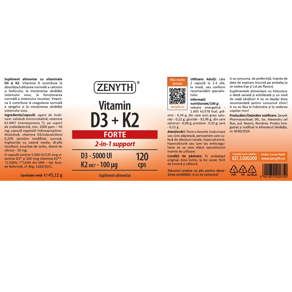 O capsulă conține 5.000 UI/125 mcg vitamina D3 și 100 mcg vitamina K2, 2.500% și 133% din VNR – Valori Nutriționale de Referință, cf. Reg. 1169/2011.