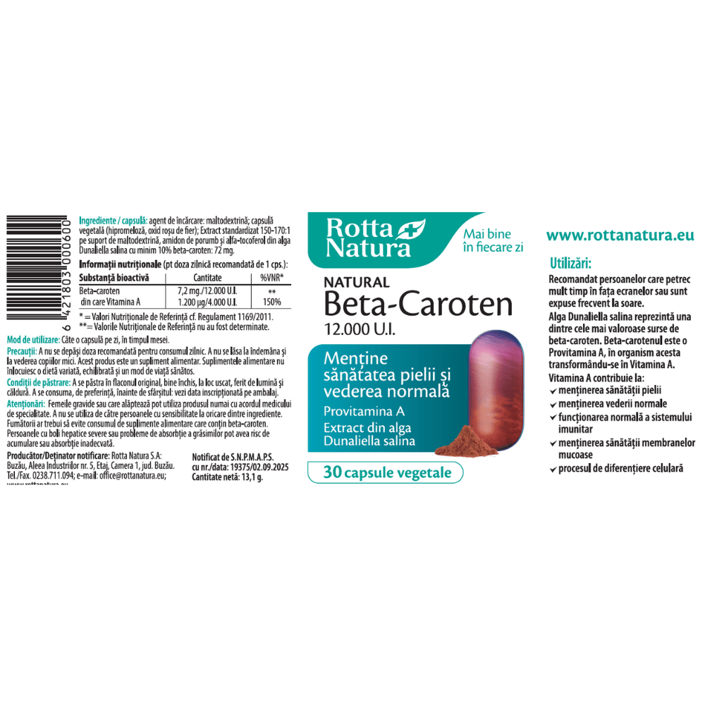 Beta-Caroten 12000 UI 30 capsule vegetale Rotta Natura(poate contribui la mentinerea sanatatii pielii) face parte din categoria supliment alimentar.