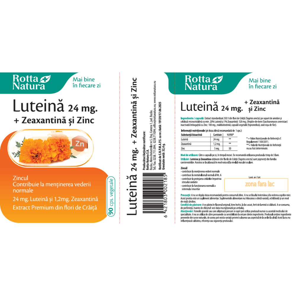 Luteina 24 mg + Zeaxantina si Zinc, 90 capsule vegetale, Rotta Natura [6421803002185]
