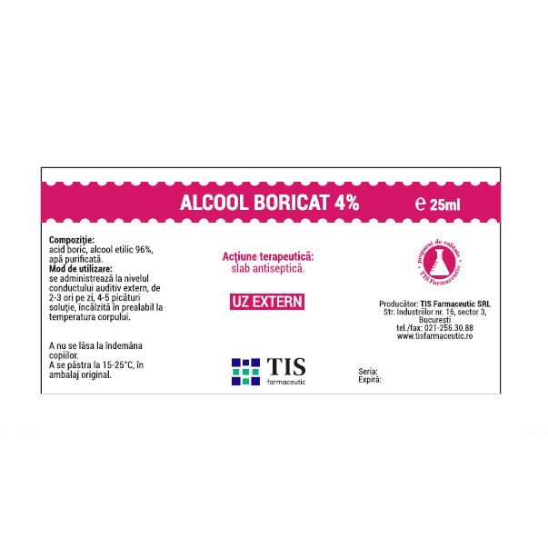 Alcool boricat 4% 25 ml Tis Farmaceutic(antiseptic local) face parte din categoria produs parafarmaceutic , contine substanța activăalcool boricat.