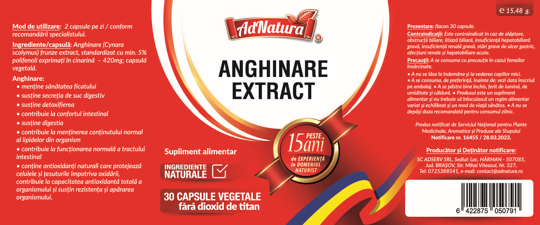 Ingrediente:Per capsulă: Anghinare (Cynara scolymus) frunze extract, standardizat cu min. 5% polifenoli exprimați în cinarină - 420mg; capsulă vegetală.