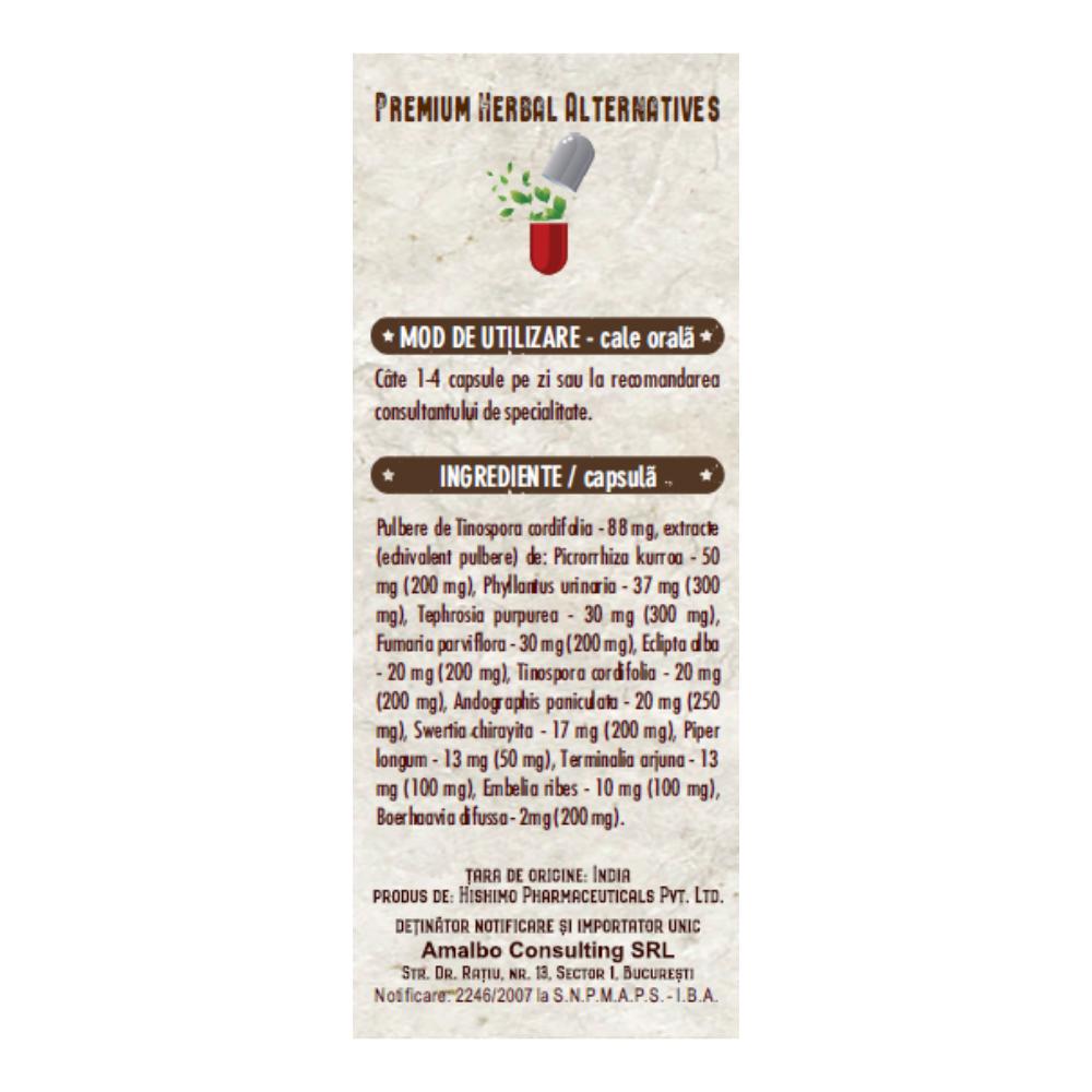 Ingrediente:Pulbere de Tinospora cordifolia 88 mg; extracte (echivalent pulbere) de: Picrorhiza kurroa 50 mg (200 mg), Phyllanthus urinaria 37 mg (300 mg), Tephrosia purpurea 30 mg (300 mg), Fumaria parviflora 30 mg (200 mg), Eclipta alba 20 mg (200 mg), Tinospora cordifolia 20 mg (200 mg), Andrographis paniculata 20 mg (250 mg), Swertia chirayita 17 mg (200 mg), Piper longum 13 mg (50 mg), Terminalia arjuna 13 mg (100 mg), Embelia ribes 10 mg (100 mg), Boerhaavia diffusa 2 mg (200 mg).
