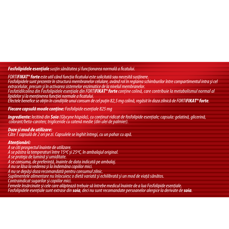 Ingrediente:lecitina din Soia (Glycyne hispida), cu coninut ridicat de fosfolipide eseniale; capsula: gelatina, glicerina, colorant/beta-caroten; trigliceride cu catena medie (din ulei de palmier).