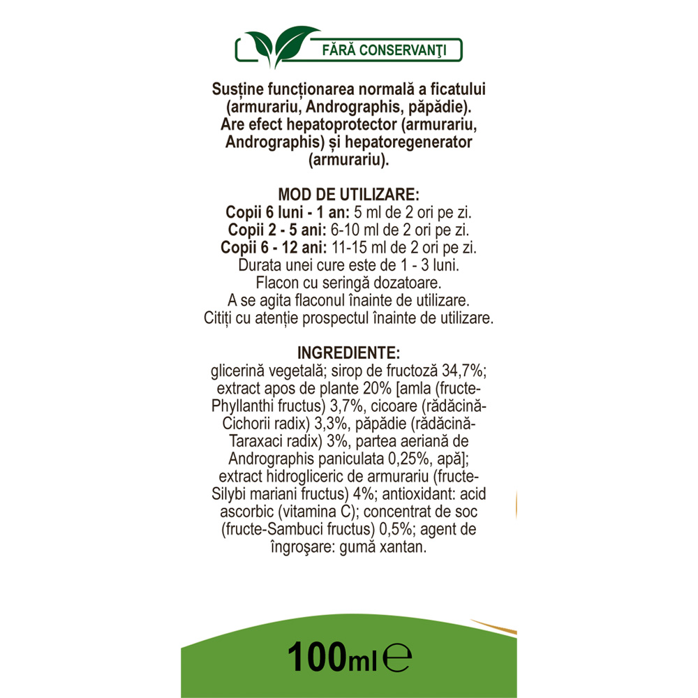 Glicerină vegetală; sirop de fructoză 34,7%; extract apos de plante 20% [amla (fructe- Phyllanthi fructus) 3,7%, cicoare (rădăcină- Cichorii radix) 3,3%, păpădie (rădăcină- Taraxaci radix) 3%, partea aeriană de Andrographis paniculata 0,25%, apă]; extract hidrogliceric de armurariu (fructe- Silybi mariani fructus) 4%; antioxidant: acid ascorbic (vitamina C); concentrat de soc (fructe-Sambuci fructus) 0,5%; agent de îngroşare: gumă xantan.