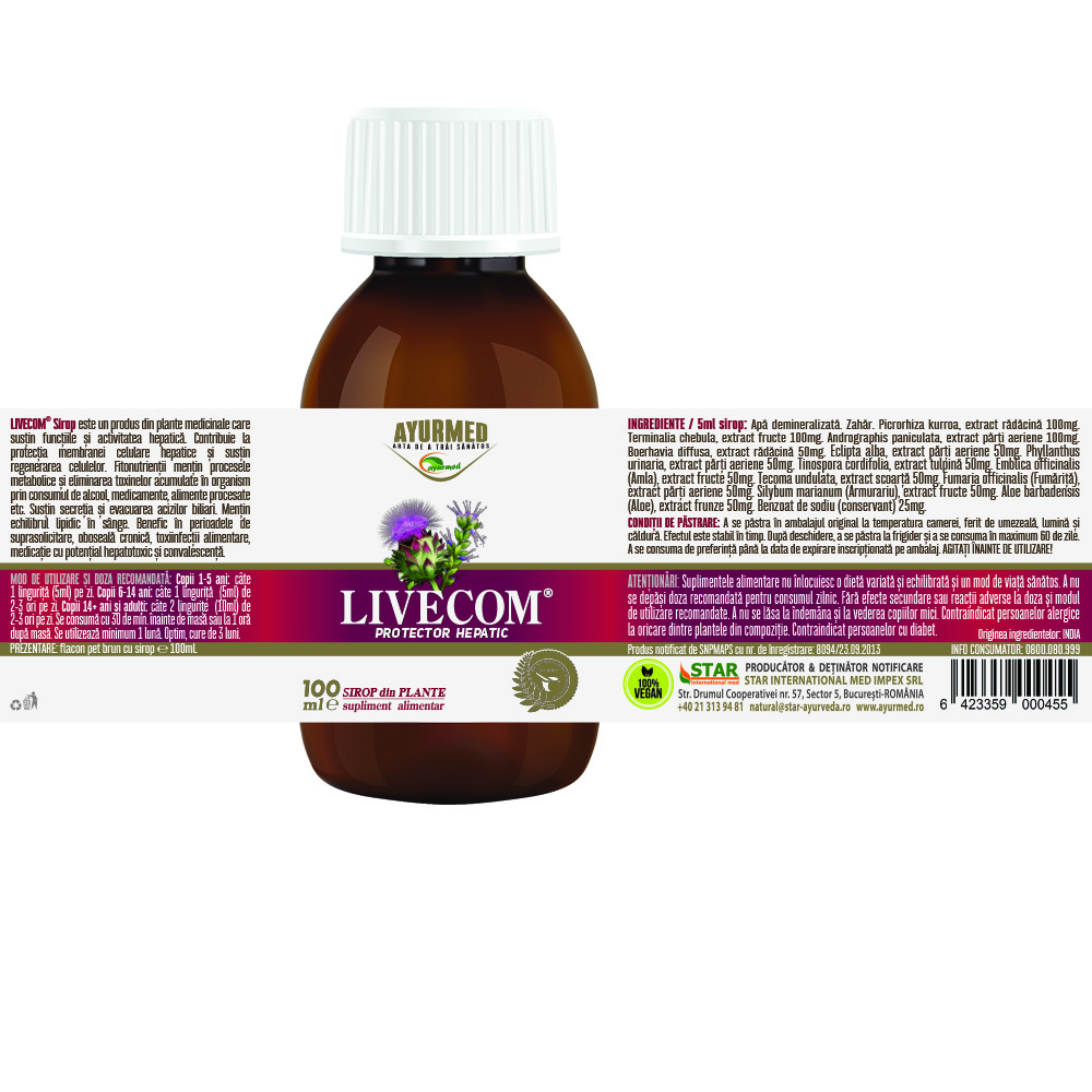 Informatii despre Sirop cu zahar Livecom, 100 ml, Ayurmed s-ar putea gasi in articolele: Ciroza hepatica, Encefalopatia hepatica, Hepatita, Steatoza hepatica (Ficat gras), Transaminazele, Protectia hepatica.