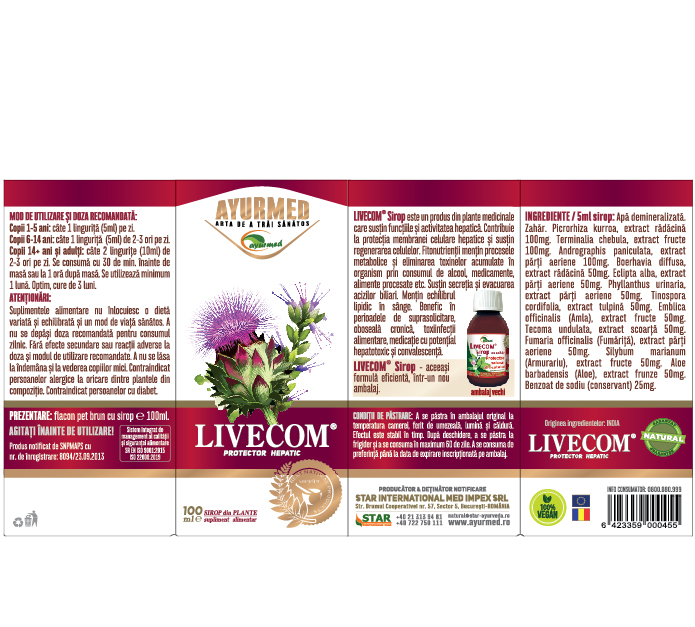 Sirop cu zahar Livecom 100 ml Ayurmed(poate contribui ca protector hepatic) face parte din categoria supliment alimentar grupa preparate fitoterapice investigatii si analize de laboratortransaminazele.