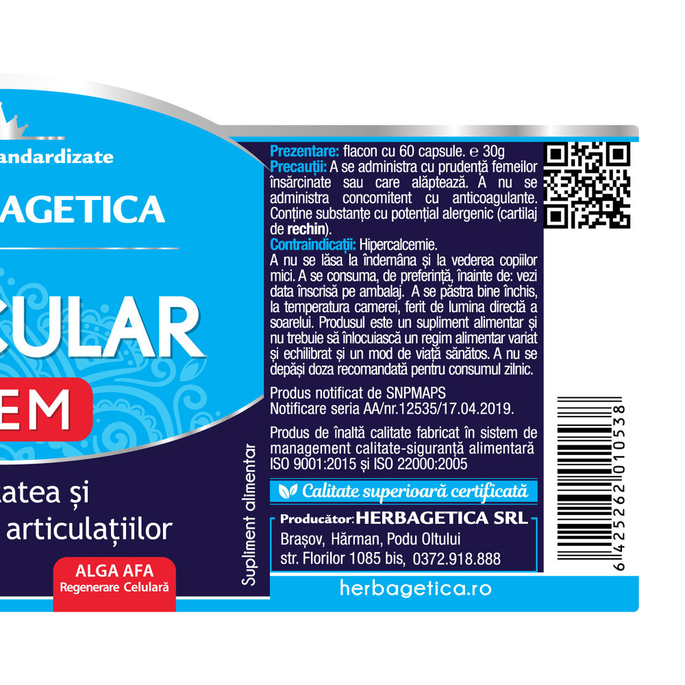 Cartilaj de rechin standardizat cu 4% Condroitina 120 mg; Alga AFA Originala, Organica (Aphanizomenon flos-aquae) 80 mg; Extract 20:1 Salcie (Salix alba) standardizat cu 25% Salicilina 80 mg; Extract 3:1 din Gheara-diavolului (Harpagophytum procumbens) standardizat cu 2% Harpagozide 40 mg; Extract 10:1 Arbore-de-tamâie (Boswellia serrata) standardizat cu 70% Acizi boswellici 40 mg; Chlorella (Chlorella pyrenoidosa) standardizata cu 50% Proteine 20 mg; Spirulina (Spirulina maxima/Spirulina platensis) standardizata cu 60% Proteine 20 mg; capsula: vegetala.