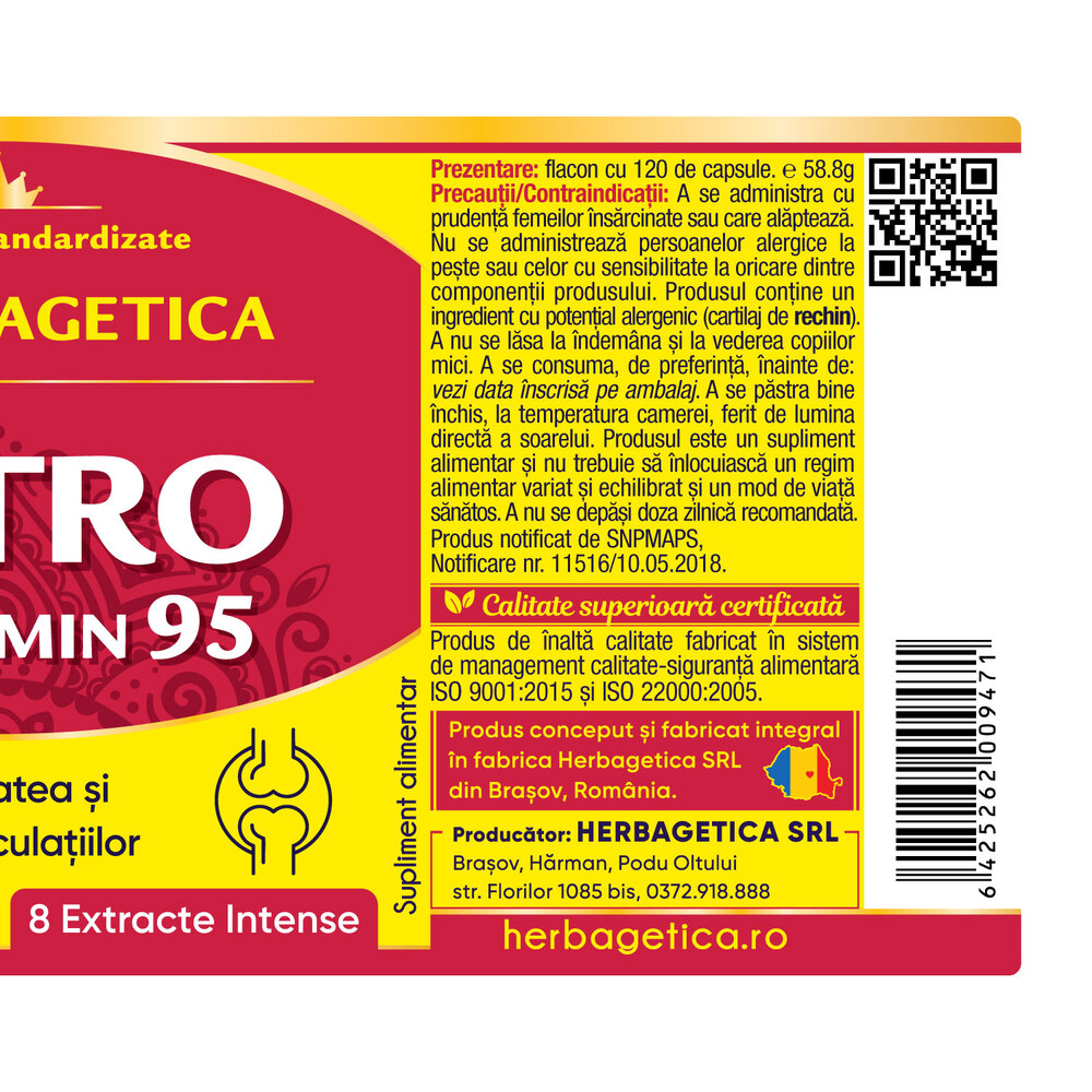 Artro Curcumin 95 120 capsule vegetale Herbagetica(contine 8 extracte) face parte din categoria supliment alimentar grupa preparate fitoterapice plante medicinaleextract de urzica (urtica dioica), extract de turmeric (curcumin, curcuma longa), extract de salcie (salix alba), extract de piper negru (piper nigrum), extract de boswellia ( tamaie, boswellia serrata).