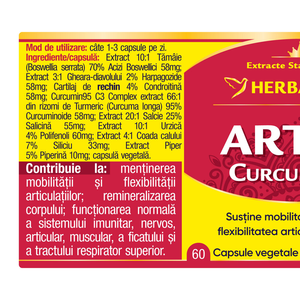 Extract 10:1 Tamaie (Boswellia serrata) 70% Acizi Boswellici 58 mg; Extract 3:1 Gheara-diavolului 2% Harpagozide 58 mg; Cartilaj de rechin 4% Condroitina 58 mg; Curcumin95 C3 Complex extract 66:1 din rizomi de Turmeric (Curcuma longa) 95% Curcuminoide 58 mg; Extract 20:1 Salcie 25% Salicina 55 mg; Extract 10:1 Urzica 4% Polifenoli 60 mg; Extract 4:1 Coada calului 7% Siliciu 33 mg; Extract Piper 5% Piperina 10 mg; capsula: vegetala.