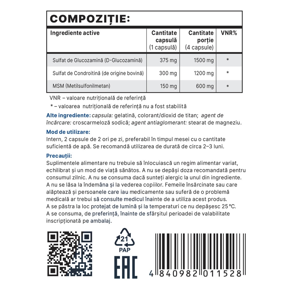| Sulfat de Condroitină (de origine bovină) | 300 mg | 1200 mg | * |