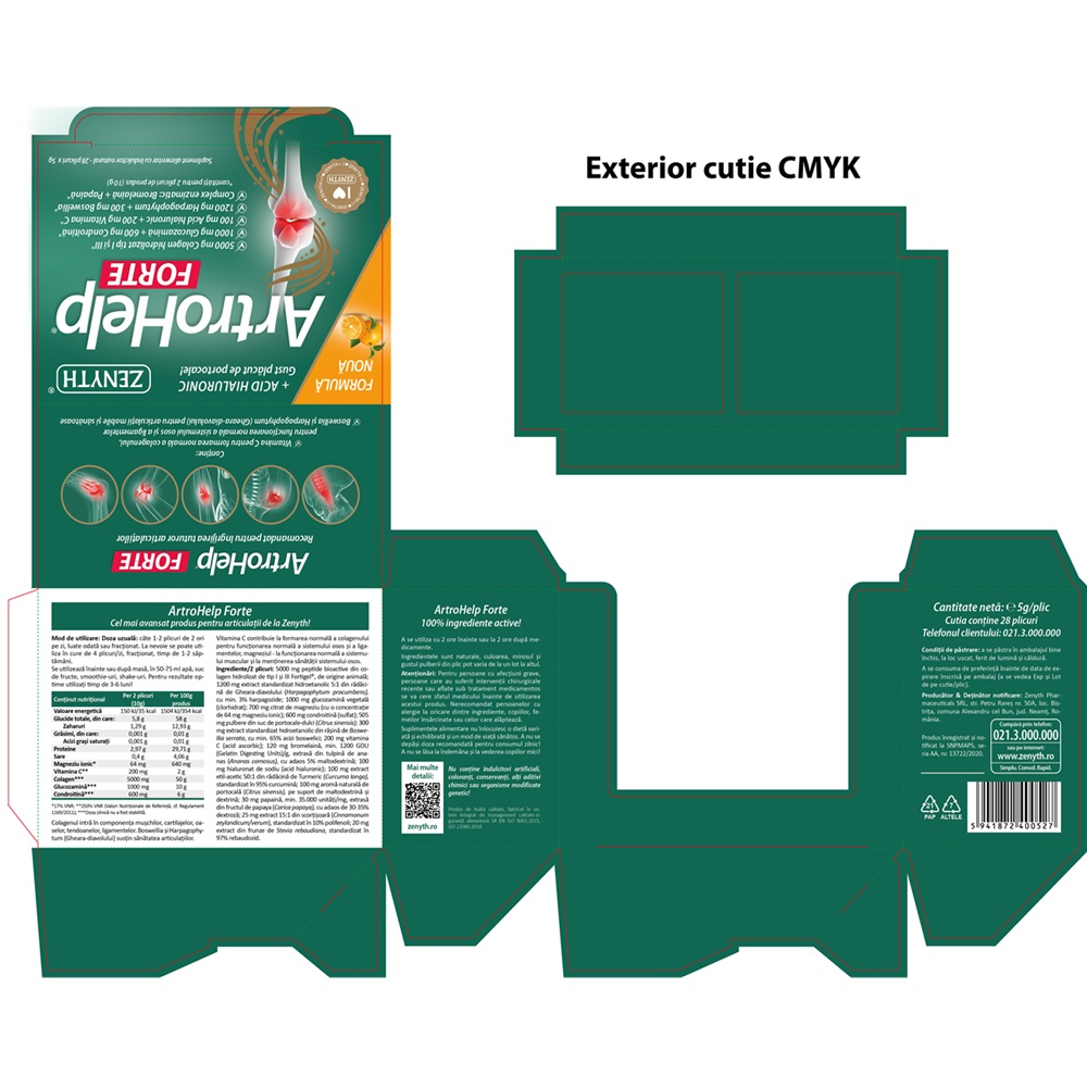 - supliment alimentar cu colagen hidrolizat de tip I si III, glucozamina, condroitina, acid hialuronic, radacina de Gheara-diavolului, Vitamina C si Boswellia serrata;