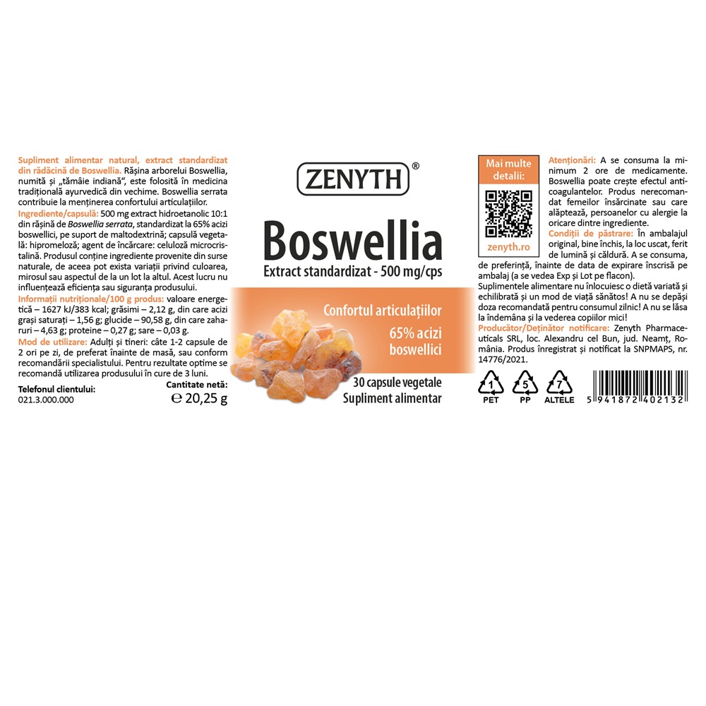 - supliment alimentar natural cu extract standardizat din radacina de Boswellia;