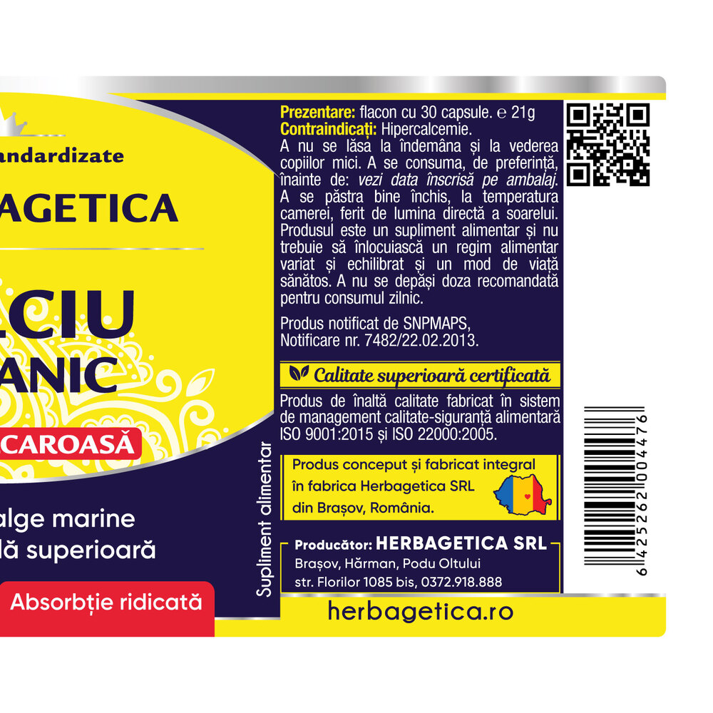Extract Alge marine calcaroase (Lithothamnium calcareum) standardizat 30% Calciu natural si 2.2% Magneziu natural marin 600mg (furnizand 180 mg Calciu, 23% VNR*); capsula: gelatina.