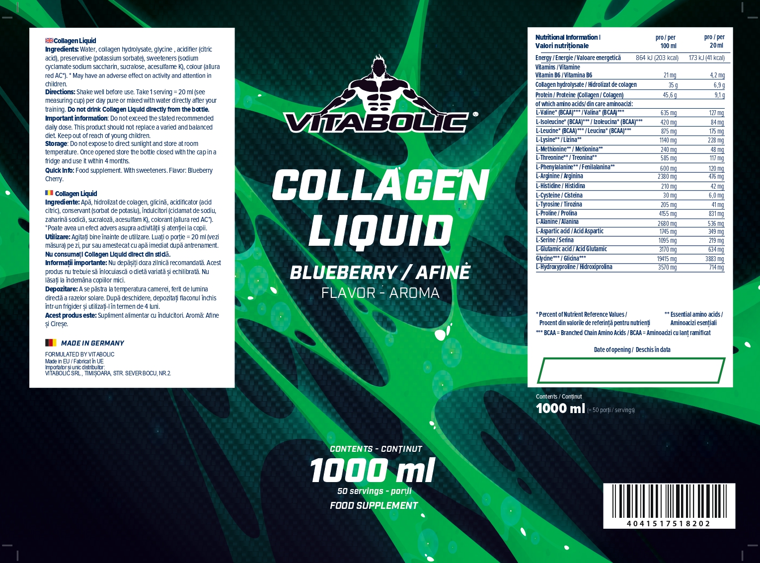Mod de administrare:Agitati bine inainte de utilizare. Luati o portie = 15 ml (vezi masura) pe zi pur sau amestecat cu apa imediat dupa antrenament. Nu consumati Collagen Liquid direct din sticla.