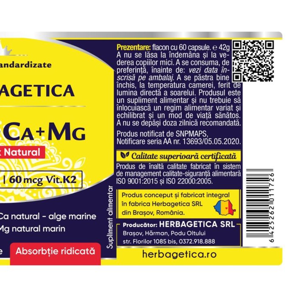 Extract standardizat cu 30% Calciu natural și 2.2% Magneziu natural marin (Lithothamnium calcareum) 435mg Magneziu natural marin standardizat cu 55% Magneziu pulbere 120 mg