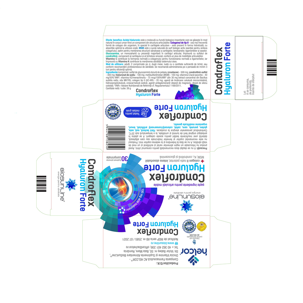 Ingrediente:/comprimat: sulfat de glucozamină clorură de potasiu (crustacee) – 500 mg; condroitină-sulfat – 300 mg; hialuronat de sodiu – 100 mg; metilsulfonilmetan (MSM) – 100 mg; vitamina C/acid ascorbic – 40 mg/50% VNR*; vitamina K2/menachinona – 75 mcg/100%VNR* (din 30 mg extract concentrat din Bacillus subtilis natto, vita MK7®); colagen tip II (UC-II®) – 20 mg; agenți de încărcare: celuloză microcristalină, hidroxipropilceluloză, croscarmeloză sodică; agenți antiaglomeranți: stearat de magneziu, dioxid de siliciu coloidal; *VNR= Valoare Nutrițională de Referință cf. Regulamentului 1169/2011.