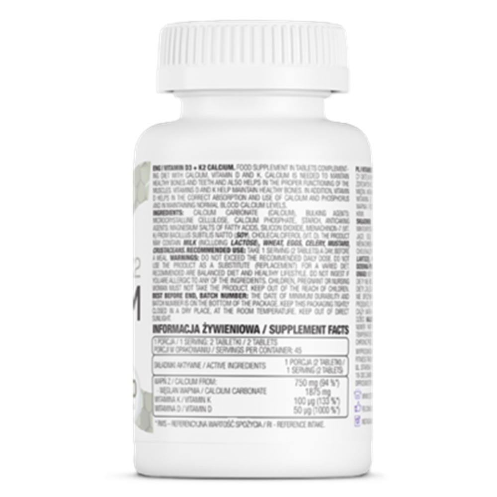 Carbonat de calciu (calciu), agent de incarcare: celuloza microcristalina, amidon, agent antiaglomerant: dioxid de siliciu, colecalciferol (vitamina D), menachinona-7 (vitamina K) din Bacillus subtilis natto.