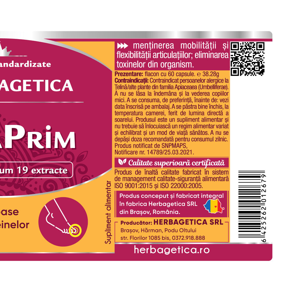Extract 10:1 Tinospora cordifolia 2.5% principii amare 85 mg; Extract 66:1 Turmeric (Curcuma longa) 95% Curcuminoide 40 mg; Extract 4:1 Telina 35 mg; Extract Phyllanthus niruri 5% principii amare 35 mg; Extract 10:1 Tamaie 70% Acizi boswellici 35 mg; Extract Gheara-diavolului 2,7% Harpagozide 35 mg; Extract 30:1 Sophora japonica 95% Quercetina 25 mg; Bromelaina 25 mg; Extract 10:1 Ghimbir 5% Gingeroli 25 mg; Drojdie-de-bere imbogatita cu B1, B2, B3, B5, B6, B8, B9, B12 25 mg; Extract 20:1 Neem 4% principii amare 25 mg; Extract 6:1 Tribulus terrestris 40% Saponine 25 mg; Extract 4:1 Armurariu 20 mg; Extract 15:1 Tulsi 2.5% Acid ursolic 20 mg; Extract Commiphora mukul 2,5% Guggulsteroni 20 mg; Papaina 15 mg; Extract Piper-negru 5% Piperina 15 mg; Extract Amla 40% Taninuri 15 mg; Extract Momordica charantia 3% principii amare 15 mg; capsula: gelatina.
