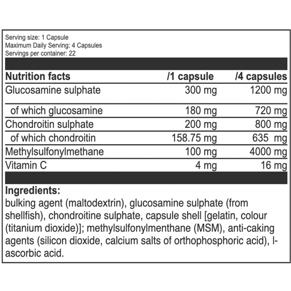 Agent de ingrosare (maltodextrina), Sulfat de Glucozamina (din crustacee), Sulfat de Condroitina, invelisul Capsulei [Gelatina, Colorant], Metilsulfonilmetan (MSM), Agenti Antiaglomeranti (Dioxid de Siliciu, Saruri de Calciu ale Acidului Ortofosforic), Acid L-ascorbic.