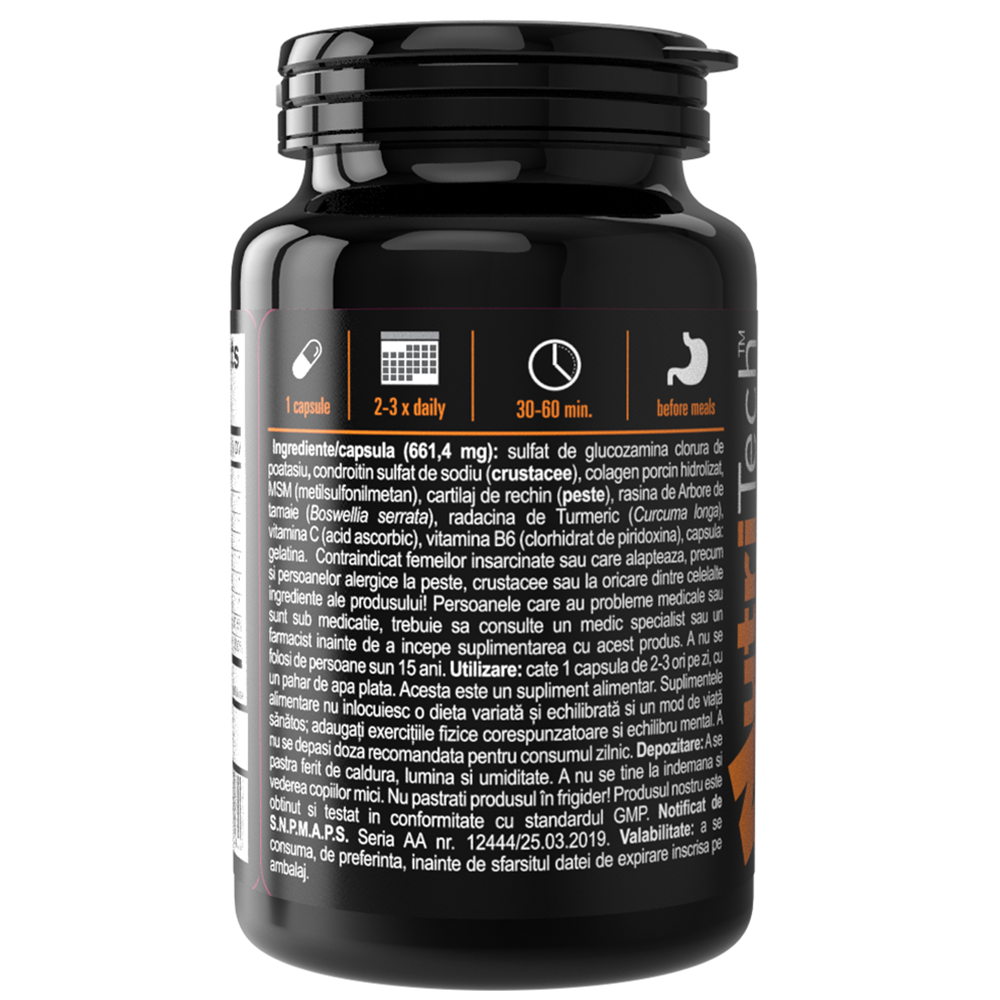 Ingrediente/capsula (661,4 mg): sulfat de glucozamina, clorura de potasiu, condroitin sulfat de sodiu (crustacee), colagen porcin hidrolizat, MSM (metilsulfonilmetan), cartilaj de rechin (peste), rasina de arbore de tamaie (Boswellia serrata), radacina de turmeric (Curcuma longa), vitamina C (acid ascorbic), vitamina B6 (clorhidrat de piridoxina), capsula: gelatina.