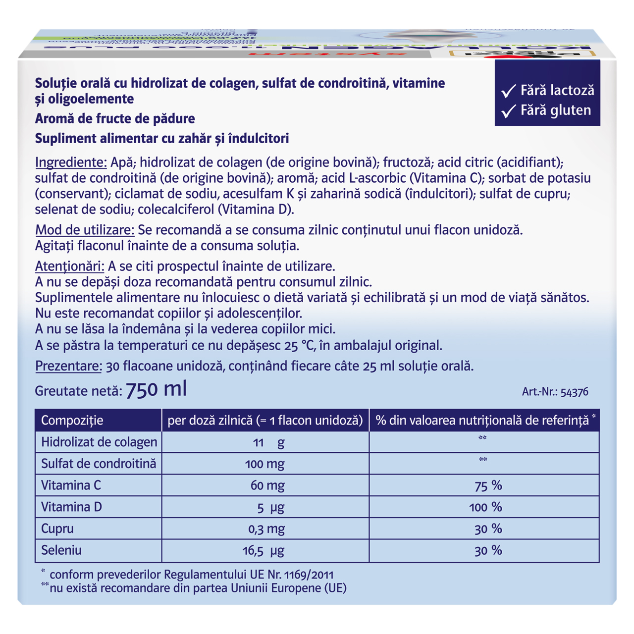 Un flacon unidoza cu 25 ml solutie orala contine: Apa, hidrolizat de colagen (de origine bovina) 44%, fructoza (indulcitor), acid citric (corector de aciditate), sulfat de condroitina (de origine bovina) 0,4%, acid L-ascorbic (Vitamina C), sorbat de potasiu (conservant), aroma, ciclamat de sodiu, acesulfam de potasiu si zaharina sodica (indulcitori), sulfat de cupru, selenat de sodiu, colecalciferol (Vitamina D).