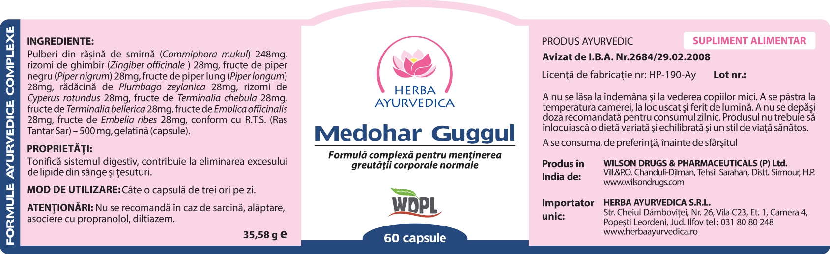 Ingrediente:Pulberi din rasina de smirna (Commiphora mukul) 248mg, rizomi de ghimbir (Zingiber officinale ) 28mg, fructe de piper negru (Piper nigrum) 28mg, fructe de piper lung (Piper longum) 28mg, radacina de Plumbago zeylanica 28mg, rizomi de Cyperus rotundus 28mg, fructe de Terminalia chebula 28mg, fructe de Terminalia bellerica 28mg, fructe de Emblica officinalis 28mg, fructe de Embelia ribes 28mg, conform cu R.T.S. (Ras Tantar Sar) - 500 mg, gelatina (capsule).