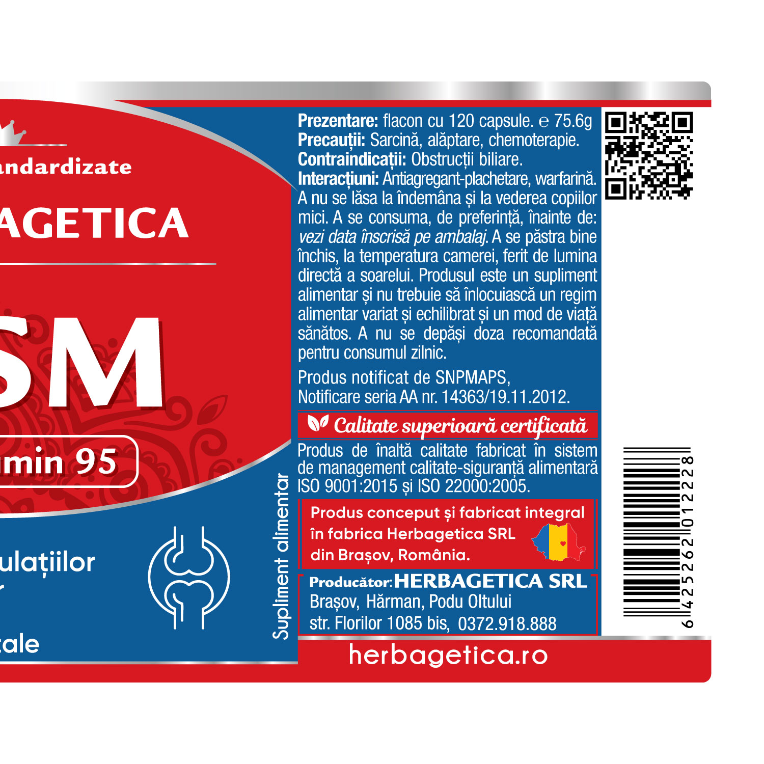 MSM (Multisulfonilmetan) pur, premium 500mg; Extract 66:1 Turmeric (Curcuma longa) 95% Curcuminoide 30mg; capsula: vegetala.