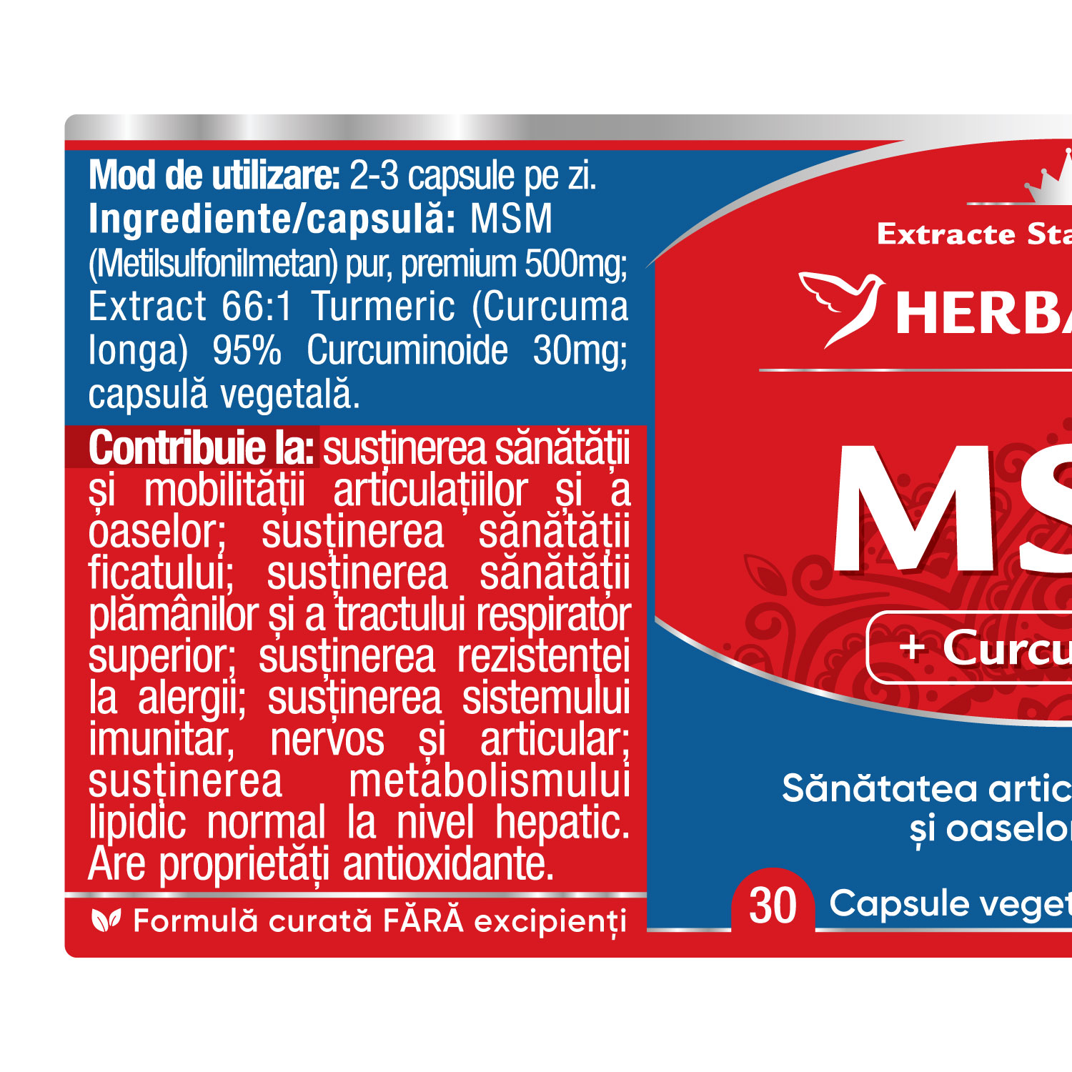 MSM (Metilsulfonilmetan) pur, premium 500mg; Extract 66:1 Turmeric (Curcuma longa) 95% Curcuminoide 30mg; capsulă vegetală.