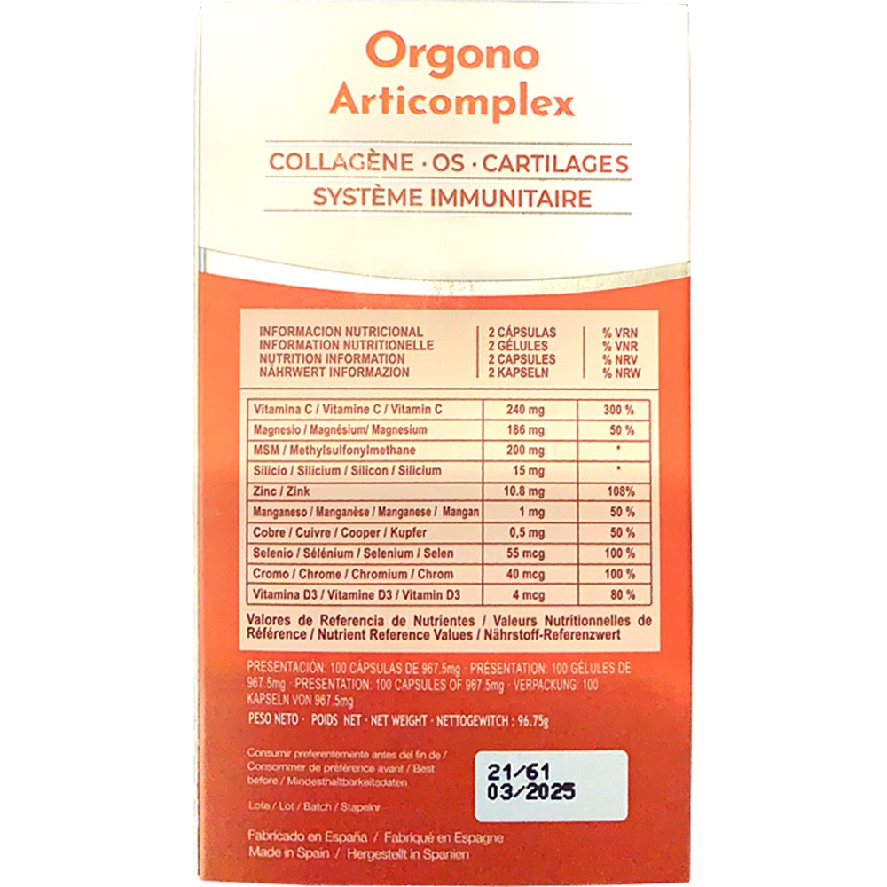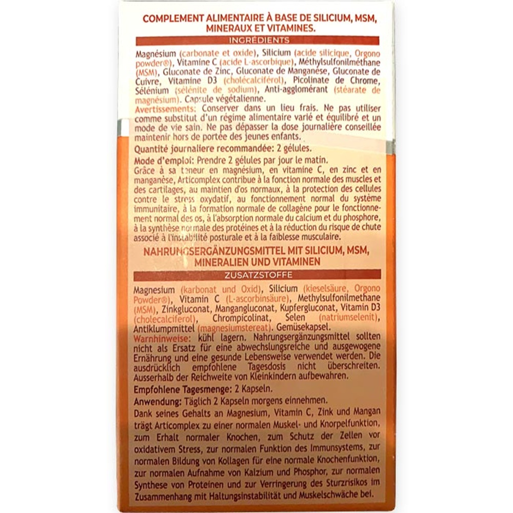Ingrediente:Magneziu (carbonat si oxid), Siliciu (acid silicic sub forma de pulbere Orgono), Vitamina C (acid ascorbic), Metilsulfonilmetan (MSM), Gluconat de zinc, Gluconat de mangan, Gluconat de cupru, Vitamina D3 (colecalciferol), Picolinat de crom, Seleniu (selenit de sodiu), antiaglomerant (stearat de magneziu), capsule vegetale.