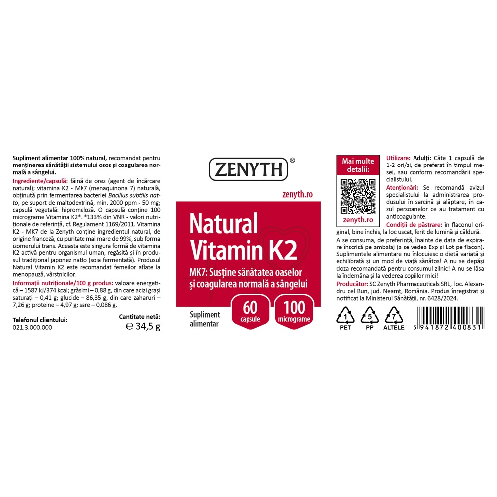 Pachet Natural Vitamina K2 60 capsule + 60 capsule Zenyth(poate contribui la sustinerea sanatatii sistemului osos) face parte din categoria supliment alimentar.