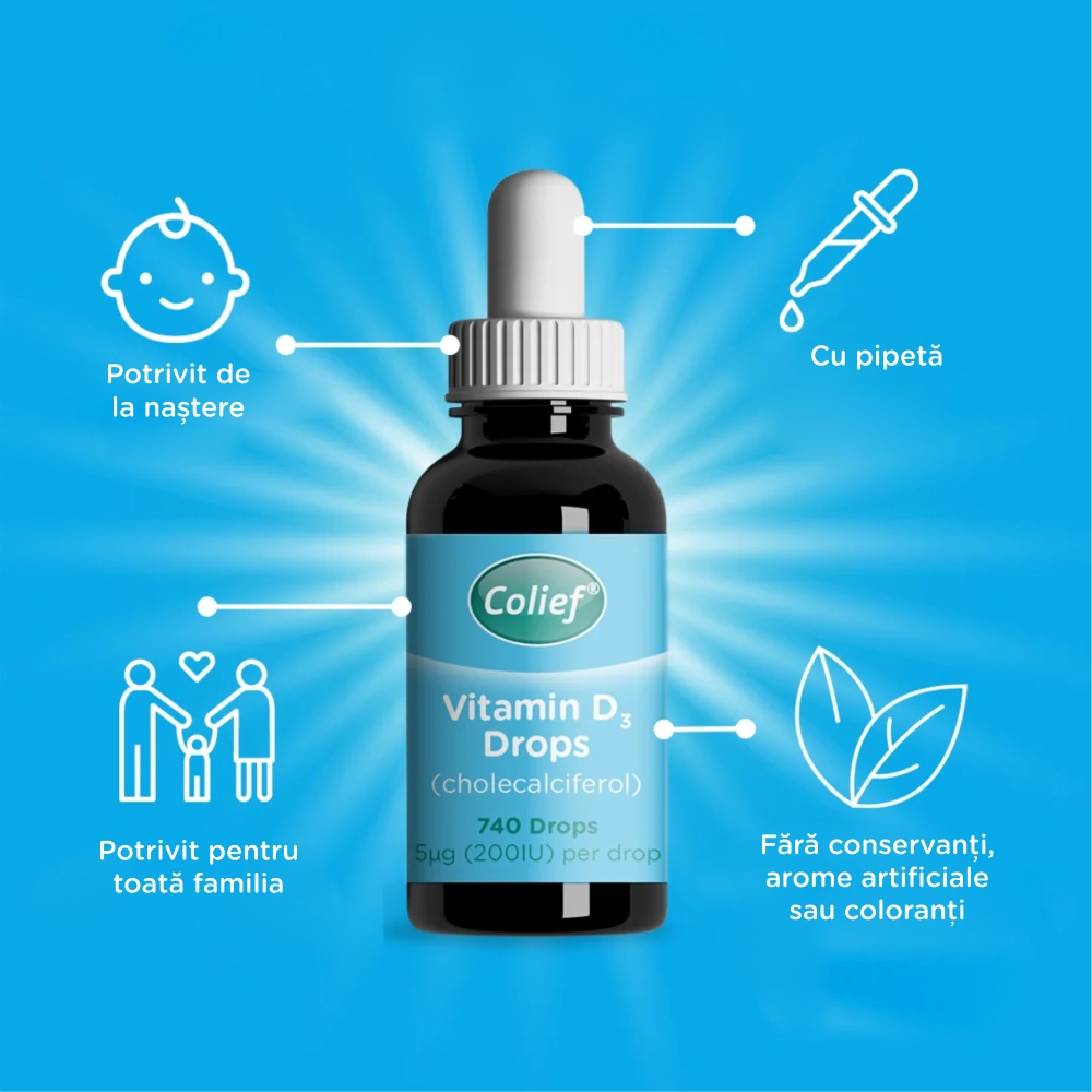 - 1 picatura contine 5 µg (200UI) vitamina D3 (colecalciferol).