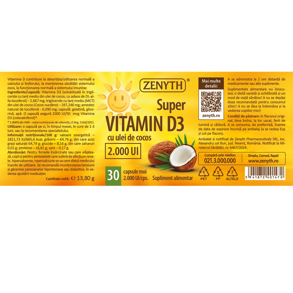 Super Vitamina D3 2000 UI 30 capsule moi Zenyth(cu ulei de cocos) face parte din categoria supliment alimentar.
