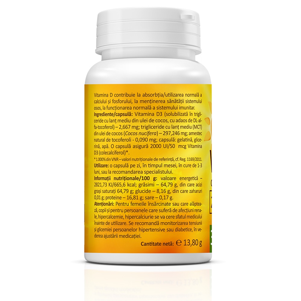 Vitamina D3 (solubilizată în trigliceride cu lanț mediu din ulei de cocos, cu adaos de DL-alfa-tocoferol)  2,667 mg, trigliceride cu lanț mediu (MCT) din ulei de cocos (Cocos nucifera)  297,246 mg, amestec natural de tocoferoli  0,090 mg, capsulă: gelatină, glicerina, apă, o capsulă asigură 2000 UI/50 mcg Vitamina D3 1.000% din VNR (Valori Nutriționale de Referință, cf. Reg. 1169/2011).
