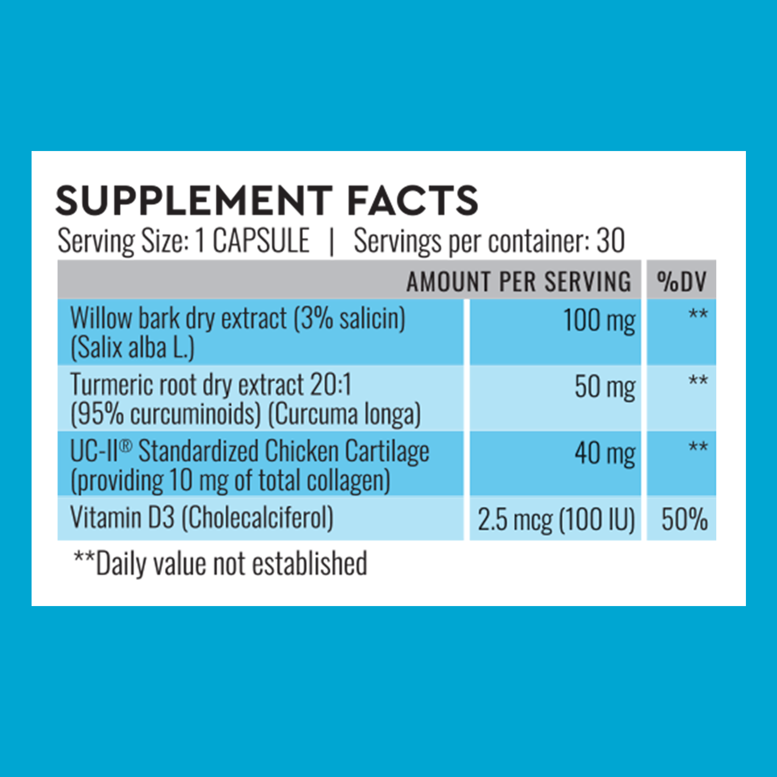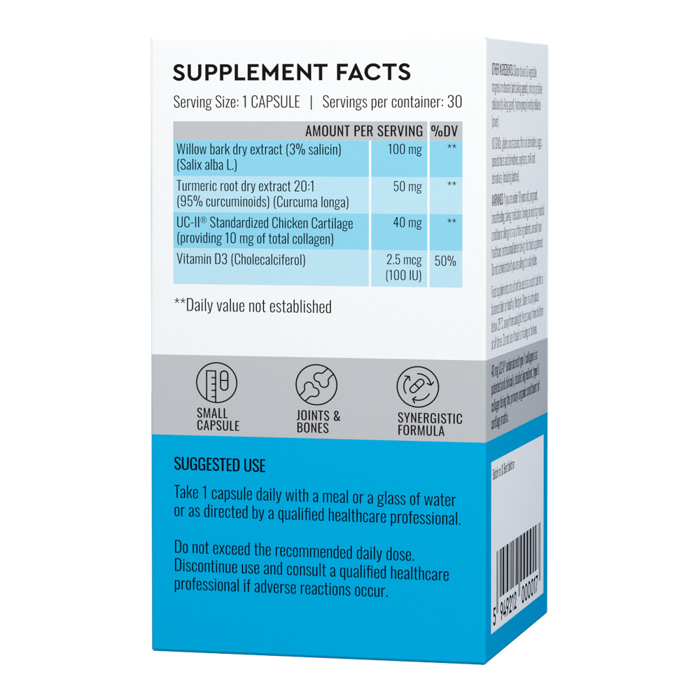 Ingrediente:Salcie alba (Salix alba)(extract din scoarta, cu 3% salicina), hidroxipropilmetilceluloza (capsula vegetala), Curcuma (Turmeric)(Curcuma: longa)(extract standardizat din radacina 20:1, cu 95%* curcuminoide), UC-II® cartilaj de pui, standardizat la: 25% [10mg] colagen total), celuloza microcristalina: (agent de incarcare), saruri de magneziu ale acizilor. grasi (sursa vegetala)(agent antiaglomerant), dioxid de siliciu coloidal (agent antiaglomerant); colecalciferol 0,25%/vitamina D3 (trigliceride cu: catena medie, amidon din porumb, guma arabica, . sucroza, dl-alfa tocoferol, dioxid de siliciu).