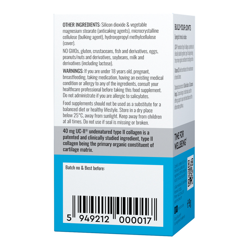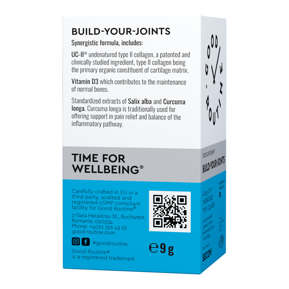 - formula sinergica ce asociaza colagenul patentat UC-II® studiat clinic - similar cu cel regasit in structurile articulatiilor cu vitamina D3, extractele standardizate de Curcuma si Salcie;