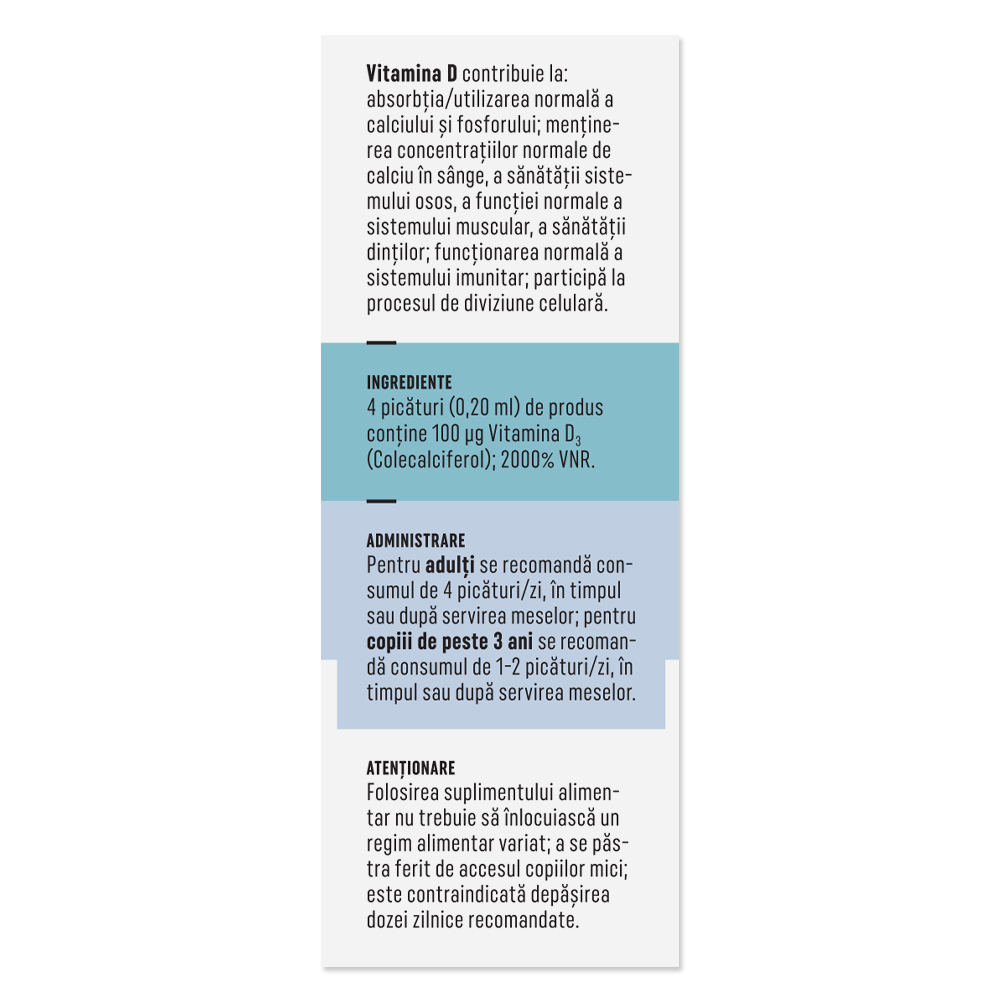 4 picaturi (0,20 ml) produs contine: 100 micrograme Vitamina D3 (colecalciferol); 2000% VNR.