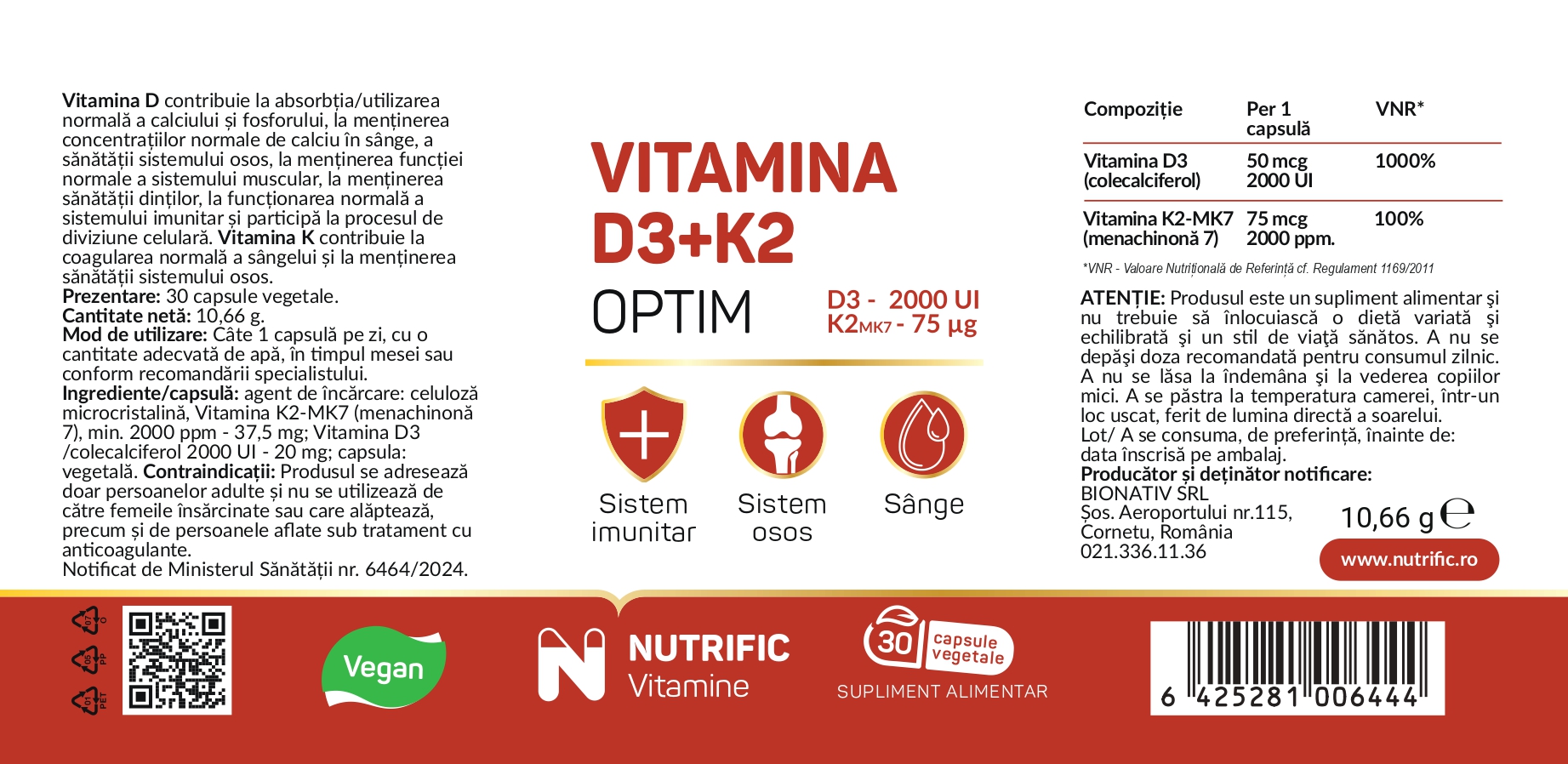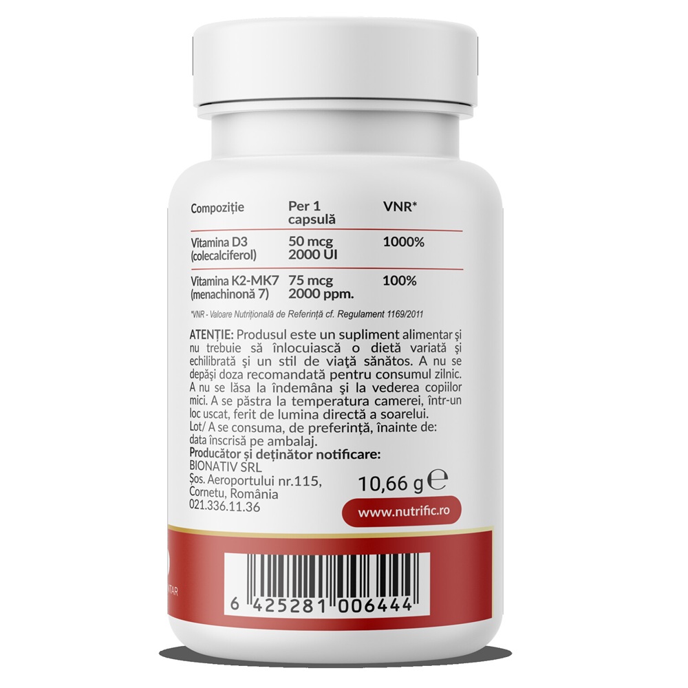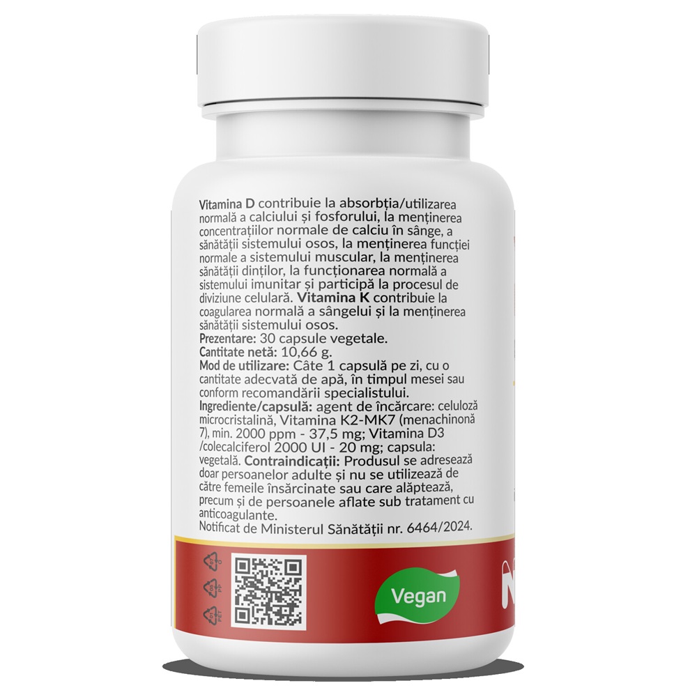 Ingrediente:Per capsula: agent de incarcare: celuloza microcristalina, Vitamina K2-MK7 (menachinona 7), min. 2000 ppm - 50 mg; Vitamina D3/colecalciferol 5000 UI - 50 mg; capsula: vegetala.