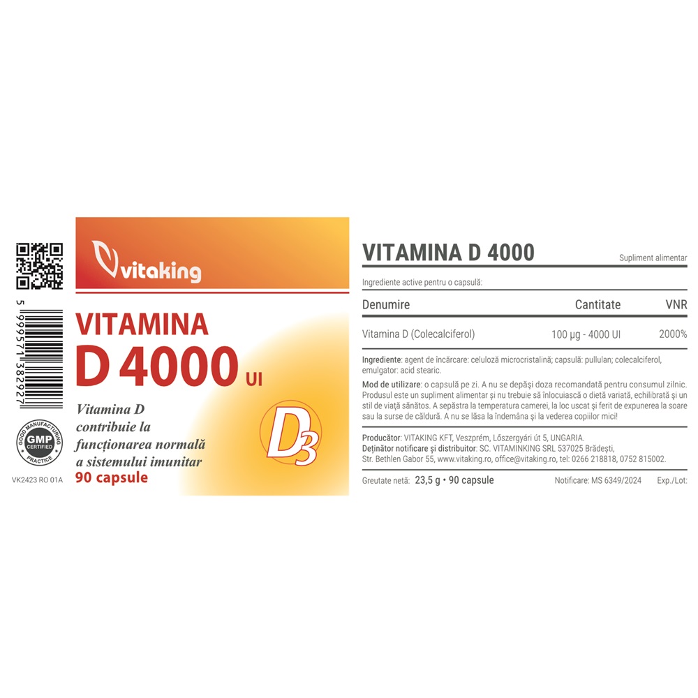 Vitamina D3 4000 UI 90 capsule Vitaking(Colecalciferol) face parte din categoria supliment alimentar.