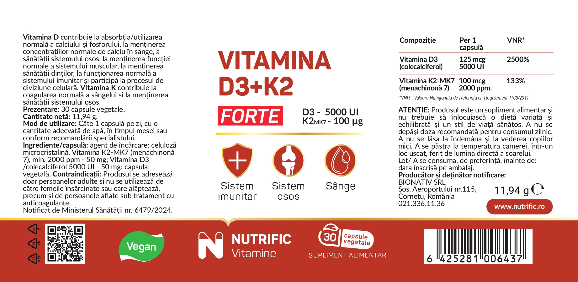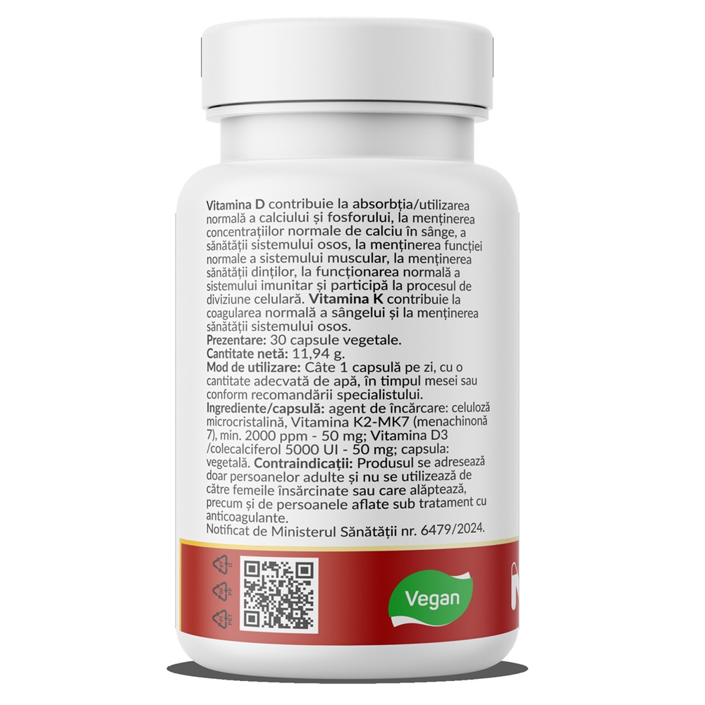Ingrediente:Per capsula: agent de incarcare: celuloza microcristalina, Vitamina K2-MK7 (menachinona 7), min. 2000 ppm - 50 mg; Vitamina D3/colecalciferol 5000 UI - 50 mg; capsula: vegetala.