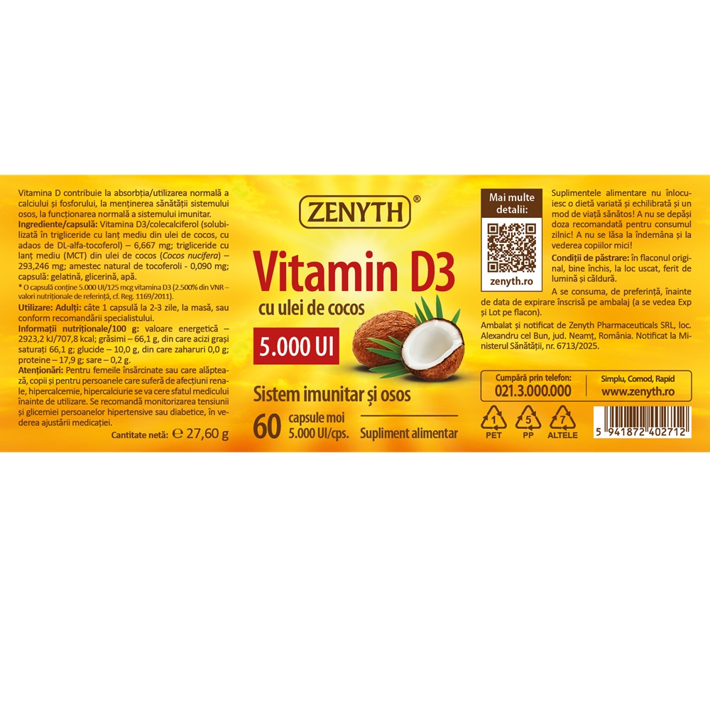 Ingrediente:Vitamina D3/colecalciferol (solubilizata in trigliceride cu lant mediu din ulei de cocos, cu adaos de DL-alfa-tocoferol) – 6,667 mg; trigliceride cu lant mediu (MCT) din ulei de cocos (Cocos nucifera) – 293,246 mg; amestec natural de tocoferoli - 0,090 mg; capsula: gelatina, glicerina, apa. O capsula asigura 5000 UI/125 mcg vitamina D3 (colecalciferol).