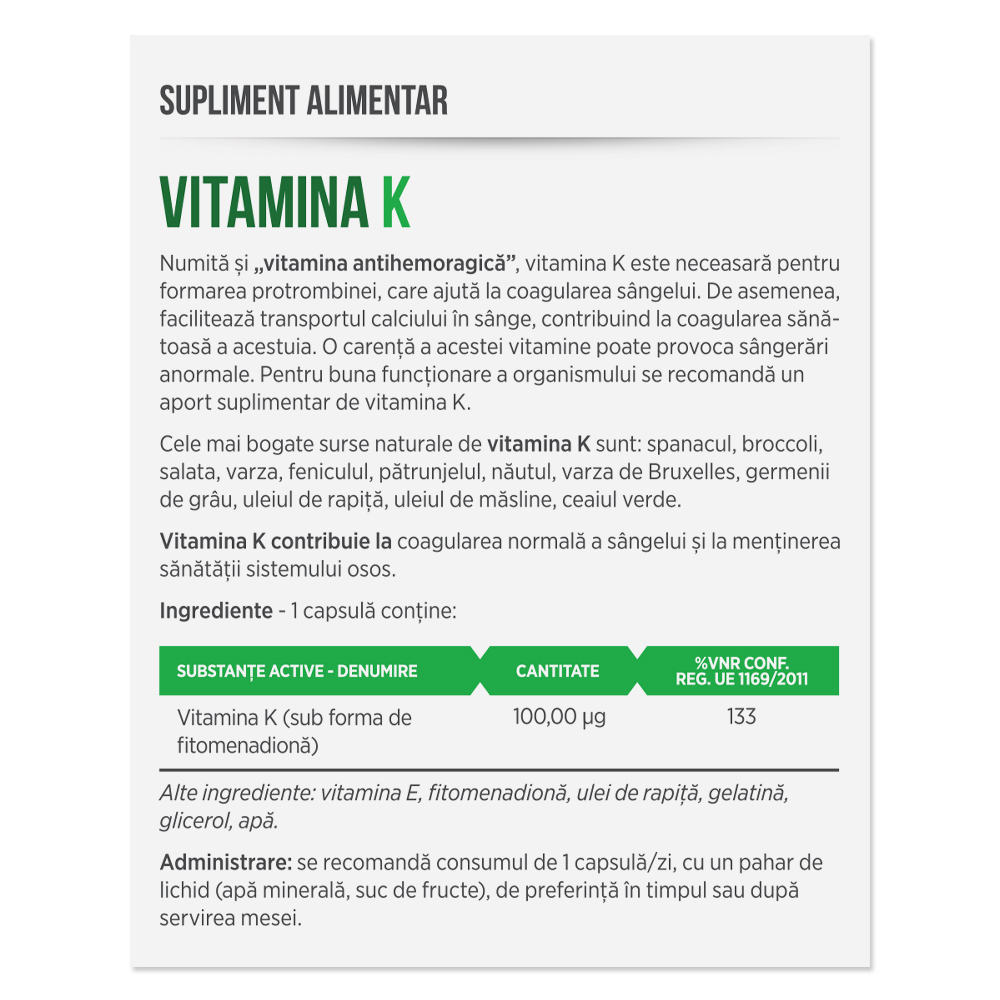 Ingrediente:Vitamina K (sub forma de fitomenadiona) 100,00 mcg