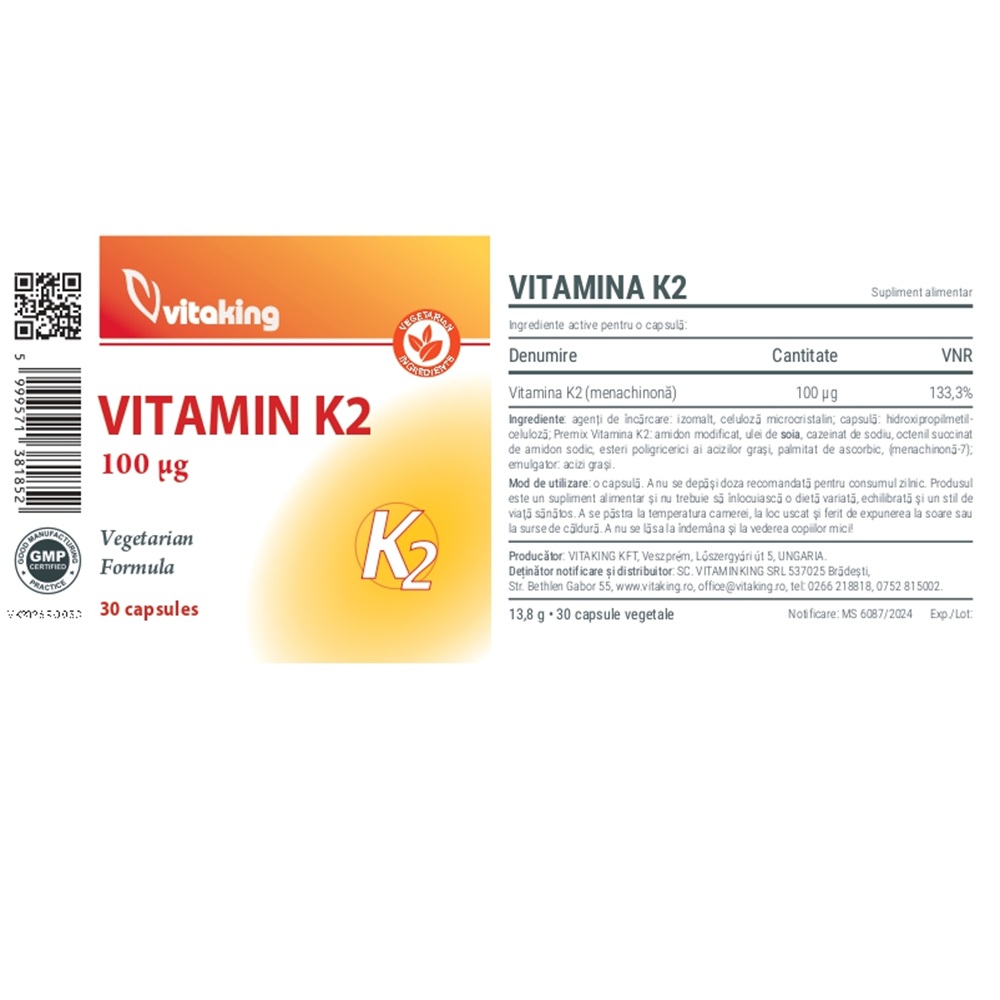 Agent de incarcare: izomalt, celuloza microcristalin; capsula: hidroxipropilmetilceluloza, premix Vitamina K2: amidon modificat, ulei de soia, cazeinat de sodiu, octenil succinat de amidon sodic, esteri poliglicerici ai acizilor grasi, palmitat de ascorbil (menachinona-7); emulgator: acizi grasi.