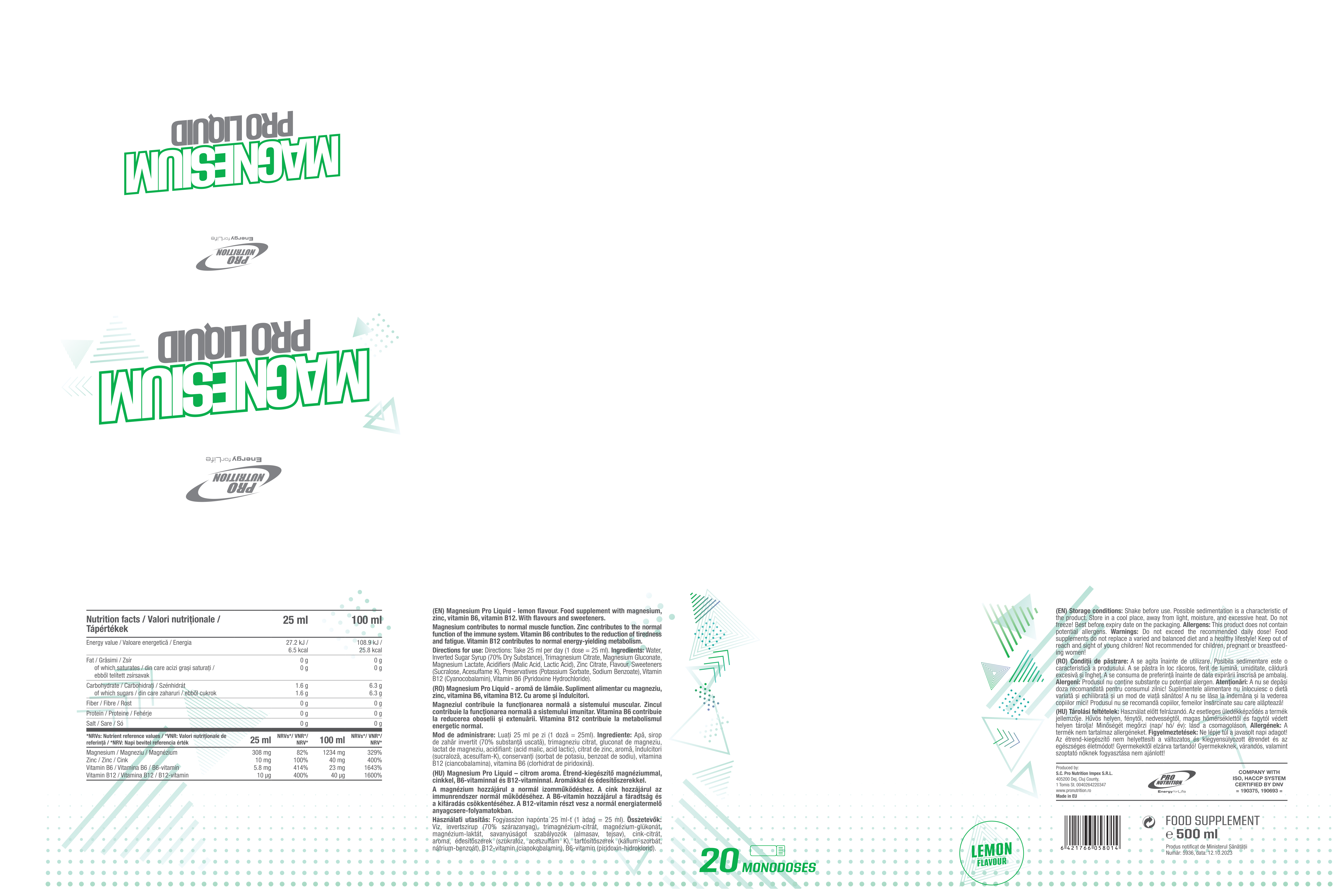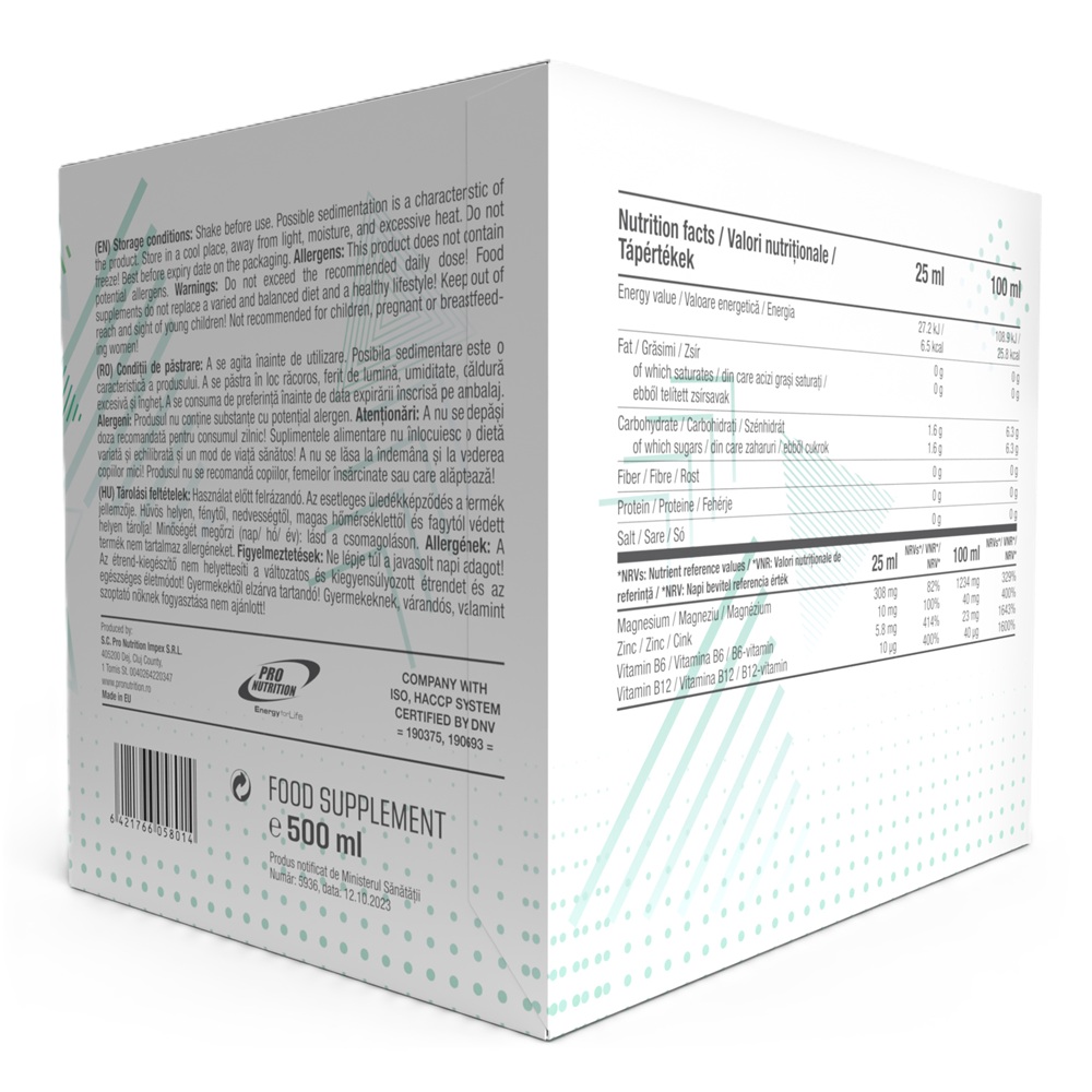Apa, sirop de zahar invertit (70% substanta uscata), trimagneziu citrat, gluconat de magneziu, lactat de magneziu, acidifiant (acid malic, acid lactic), citrat de zinc, aroma, indulcitori (sucraloza, acesulfam-K), conservanti (sorbat de potasiu, benzoat de sodiu), vitamina B12 (ciancobalamina), vitamina B6 (clorhidrat de piridoxina).